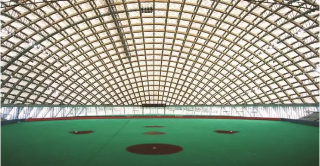 1997年建成的日本大树海体育馆采用双向胶合木杆件和支撑构件组成的三维桁架结构,其长边的上下弦杆与短边杆通过方钢管连接件和螺栓连接,形成一个178m(长)×157m(宽)×18.3m(高)的大跨度穹顶空间。屋顶的拱形构架是秋田杉木的构件,表皮采用聚四氟乙烯的白色半透明材料,与杉木构架的结合给人亲切舒适的感觉,该体育馆也成为当地的地标性建筑(见图3)。