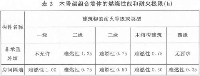 (3)木骨架组合墙体的燃烧性能和耐火极限应符合下表2的规定,其他要求应符合现行国家标准《木骨架组合墙体技术规范》GB/T 50361的规定。