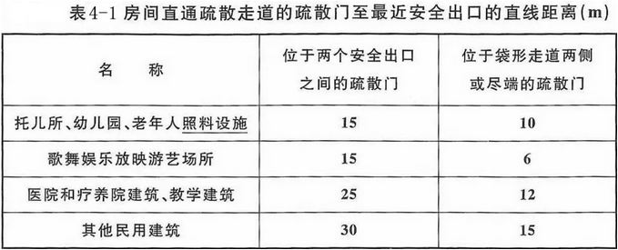 (2)房间直通疏散走道的疏散门至最近安全出口的直线距离不应大于下表4-1的规定;
