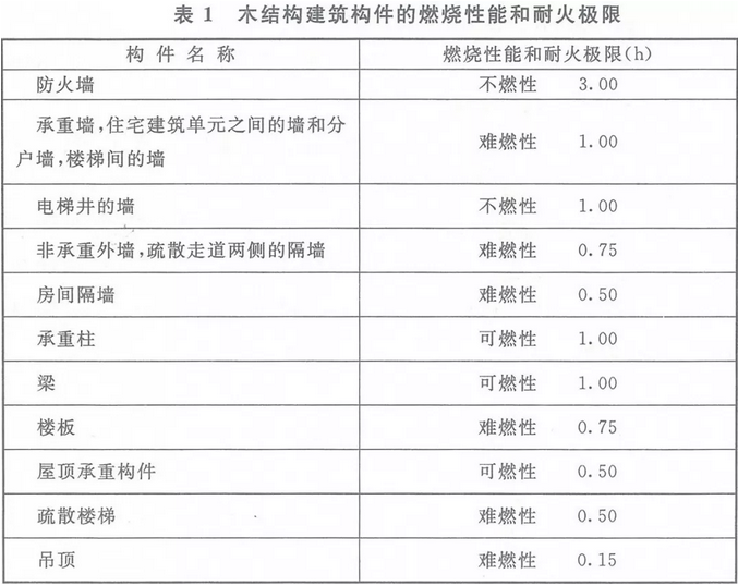 1、木结构建筑的防火设计可按本文的规定执行。建筑构件的燃烧性能和耐火极限应符合下表1的规定。
