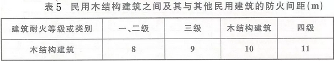 10、民用木结构建筑之间及其与其他民用建筑的防火间距不应小于下表5的规定。