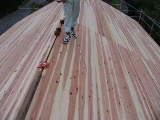 第一道屋面板的上部,为了通风透气防止木结构屋面的潮湿,特设置一层通风构造层木条,上面再准备安装第二道屋面板。