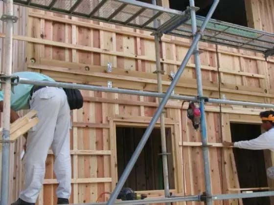 ▲ 木结构住宅外部墙壁施工现场特写