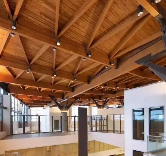(5)其他木结构建筑等。如体育馆、会堂、影剧院、图书馆、学校、医院、幼儿园等公共建筑。在现代建筑中,利用木结构施工容易、材料轻的特点建造别具风格的异型楼顶,对上世纪70~90年代建造的平顶房进行平改坡的改造工程。