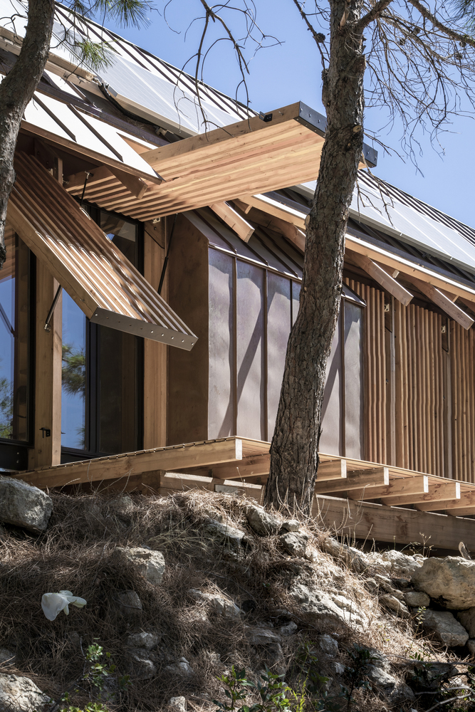 落叶松木结构以及封闭的面板是提前制作好的,所以很容易在现场安装以减少安装时间。陡峭的三角形屋顶覆盖物的细部由三种材料组成 - 木头,铝和铜;最新的一种材料被用来覆盖MU50。 这是一个多缝的被动气候控制表面:当层压木屋顶结构上方的热防护和防水层面板饰提供了常规系统的功能时;安装在实际屋顶表面上方的铜表面可通过在设备上方产生连续的空气流动和遮挡来提供有效的被动控制并减少热量获取。该屋顶还装有光伏板和太阳能板,使它们成为设计语言的集成组成部分。该部门采用了减少环境影响的技术。