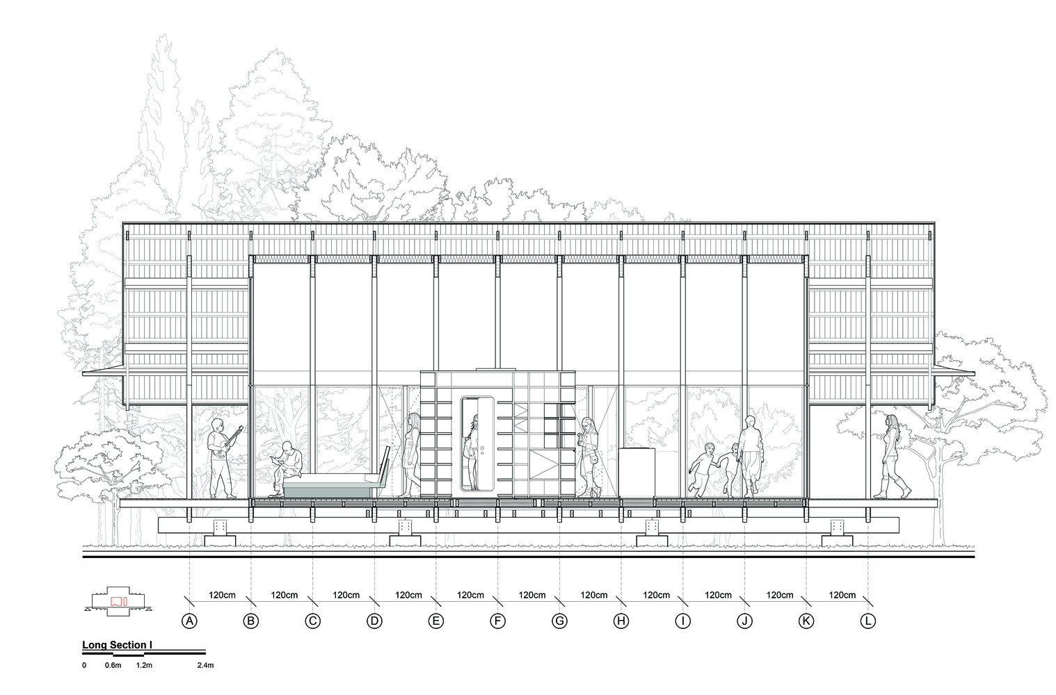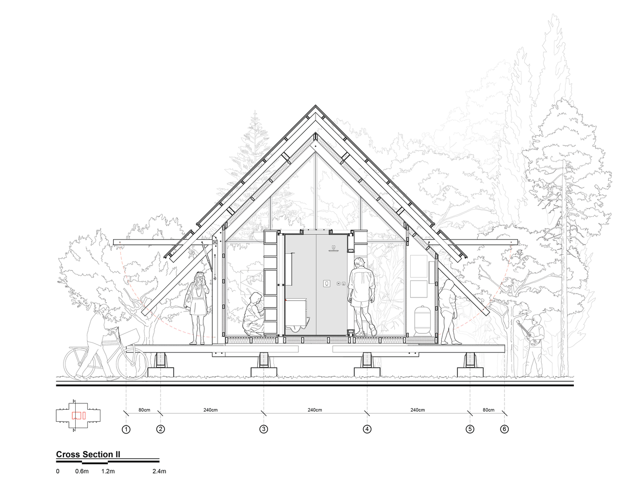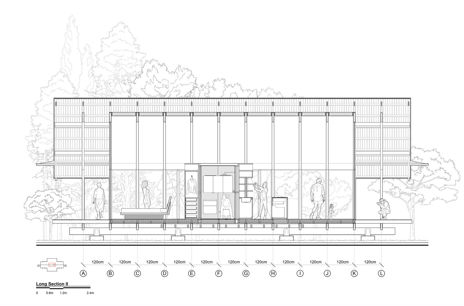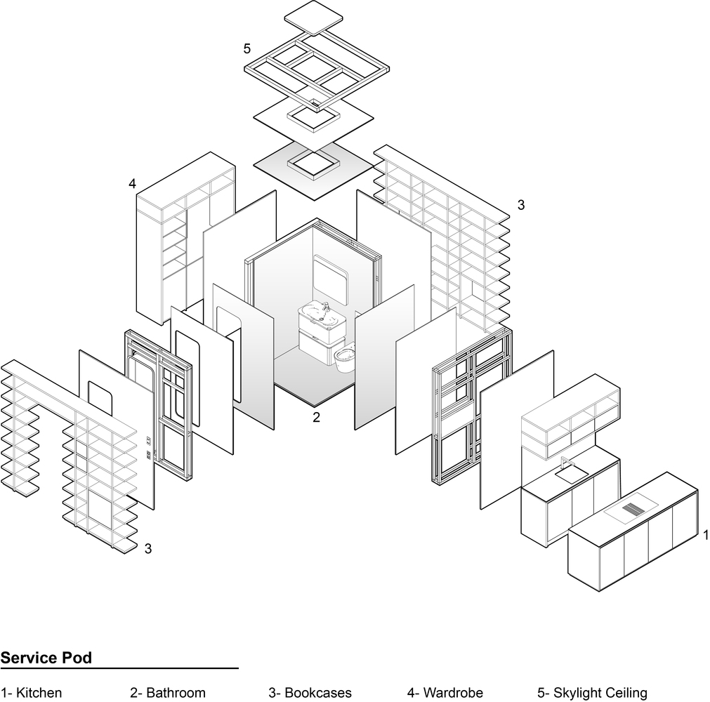 该模块化系统的元素可以在数量和材料上变化以容纳不同的建筑功能。随着更多的结构框架的增加,建筑物变得越来越大;它可以保持一个单一,简约,矩形的空间,也可以按一个或多个服务吊舱细分。因此,重复并结合少量相对简单的建筑元素的简单动作就可以产生适合不同用途的各种空间 - 从小型冥想室到住宅。