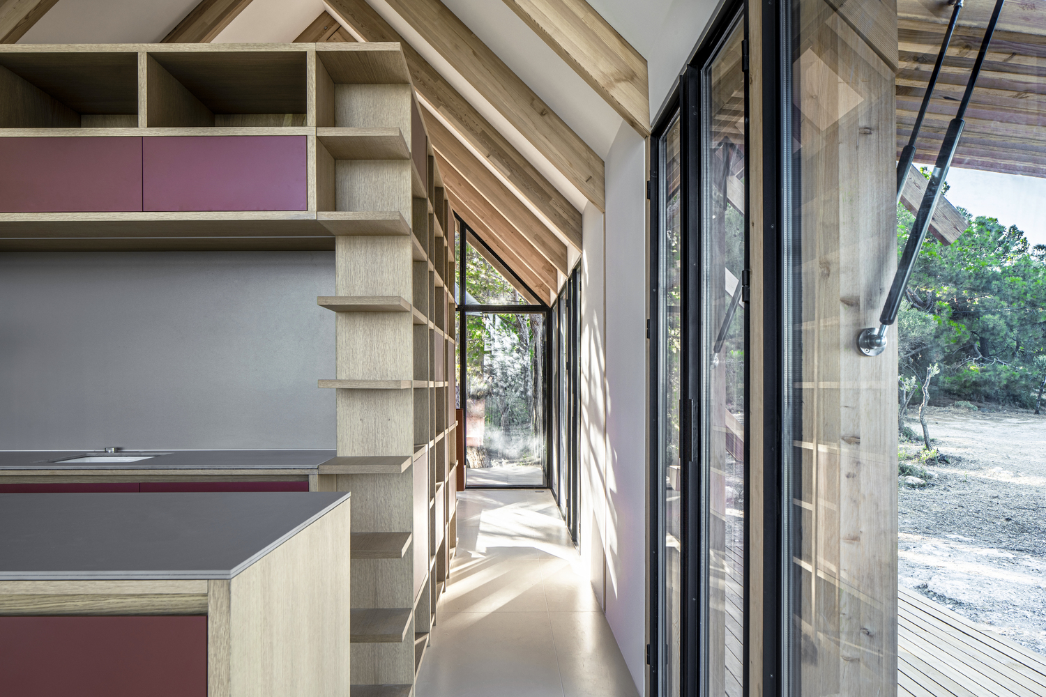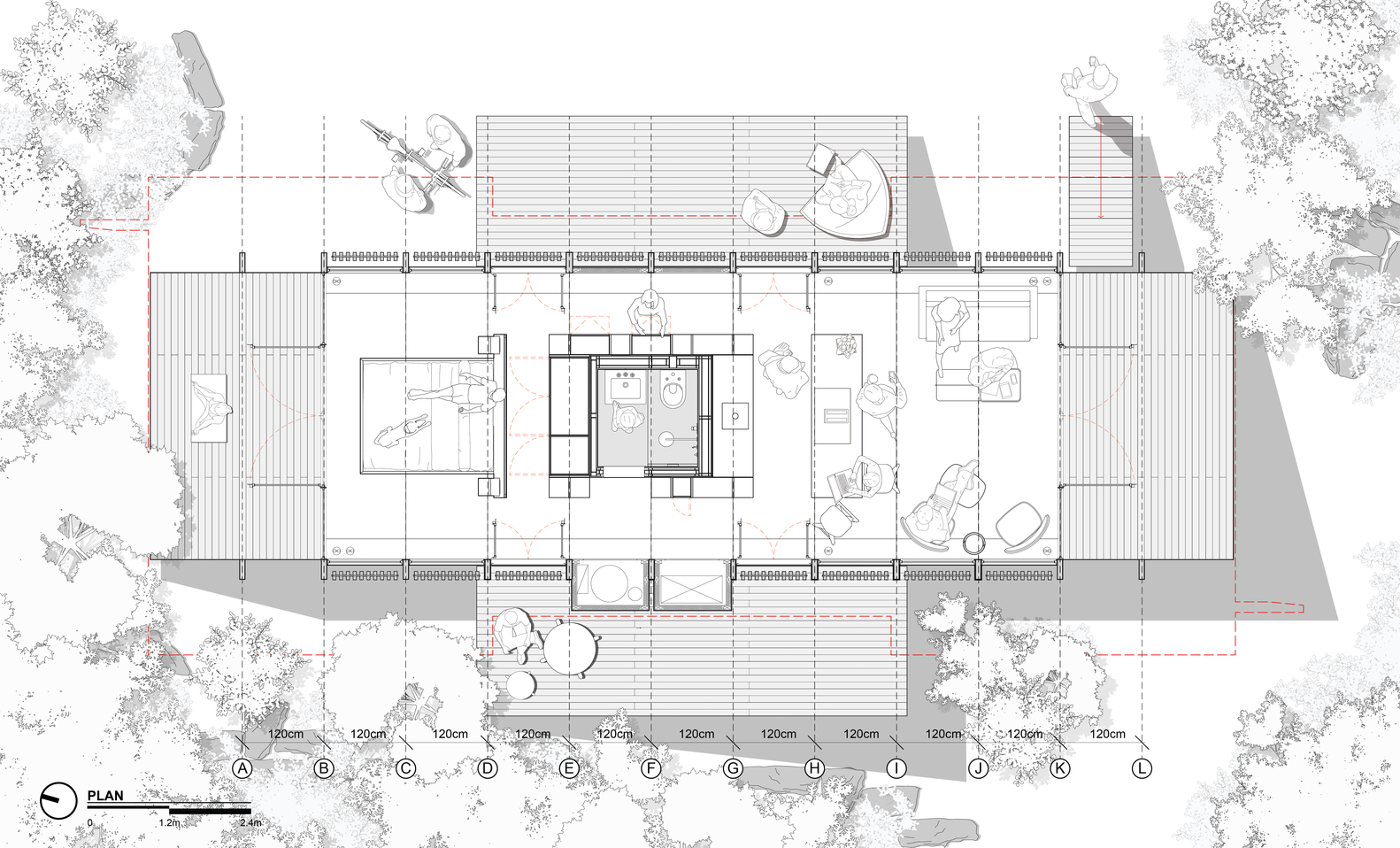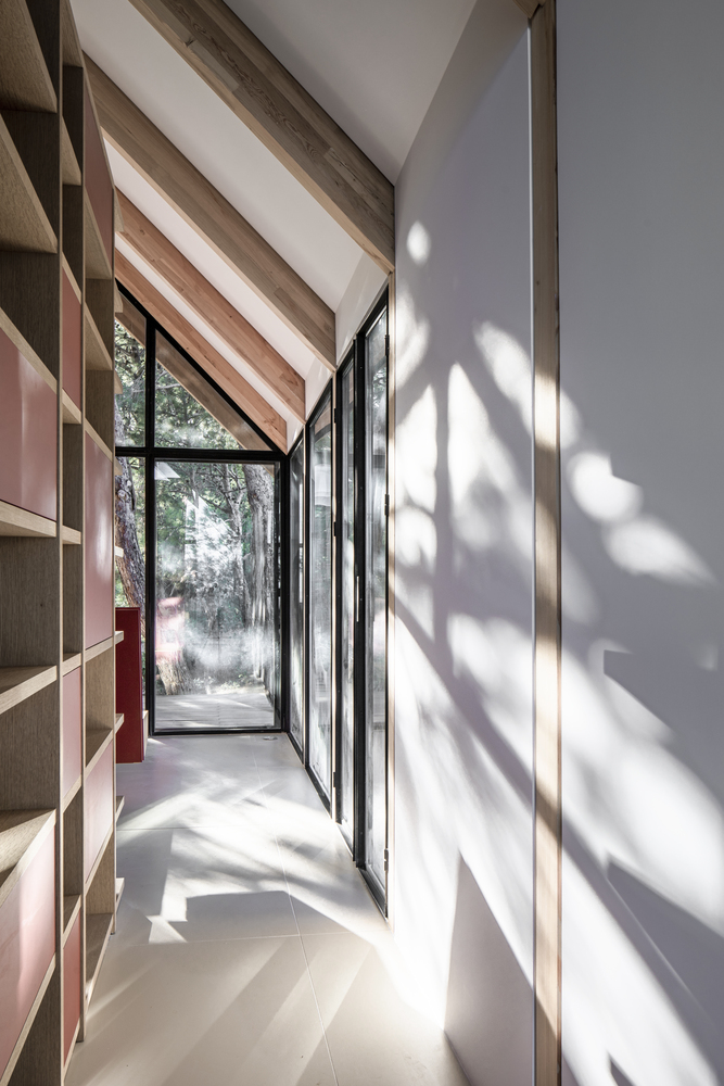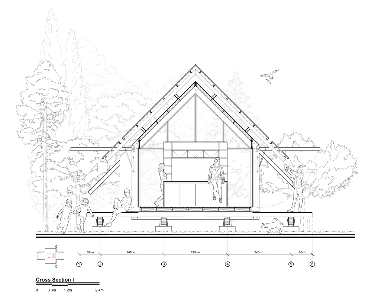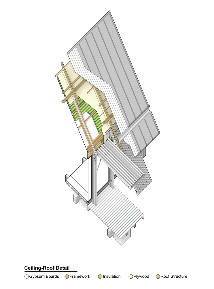 该模块化系统的元素可以在数量和材料上变化以容纳不同的建筑功能。随着更多的结构框架的增加,建筑物变得越来越大;它可以保持一个单一,简约,矩形的空间,也可以按一个或多个服务吊舱细分。因此,重复并结合少量相对简单的建筑元素的简单动作就可以产生适合不同用途的各种空间 - 从小型冥想室到住宅。