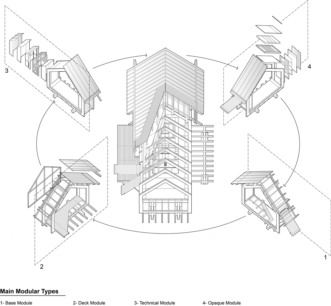 作为一个建筑原型,无论用途或建造地点是什么,模块化系统的元素被设计成可重复使用和可回收材料构造而成,这些材料易于获得,并且可由本地建筑商在任何特定地点进行组装。这种基本的设计选择确保了对任何大小和用途的建筑物的环境影响最小。从基本元素的重复产生的空间配置有利于自然采光和通风。收集水和制造能源的系统可以被添加到基本单元中,使它们可以完全脱离电网的限制。
