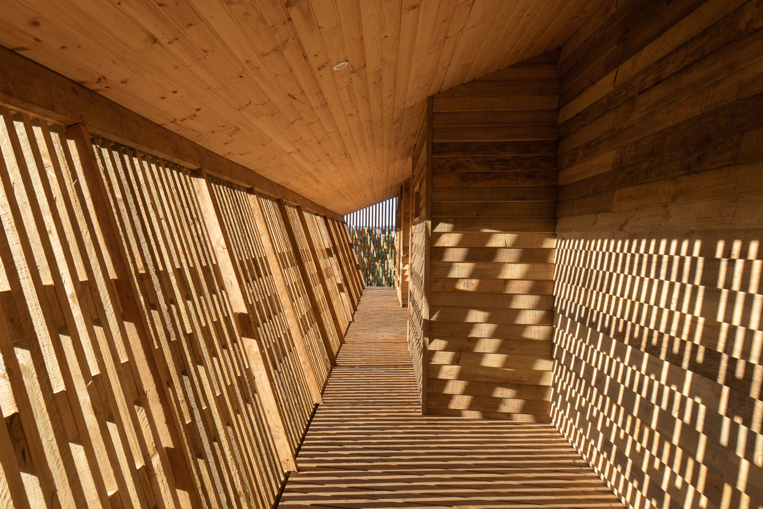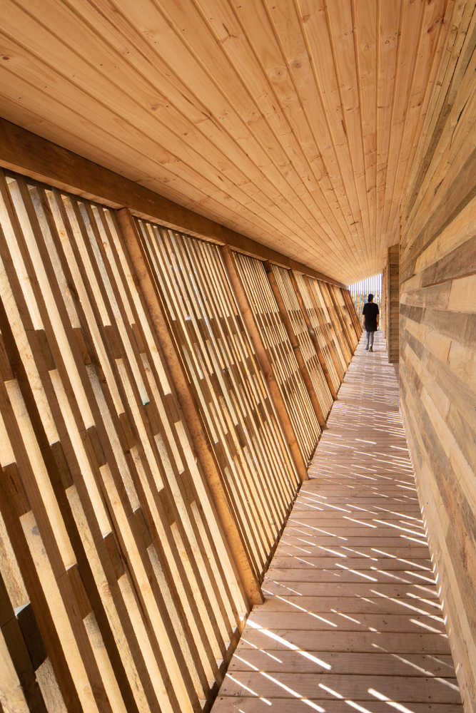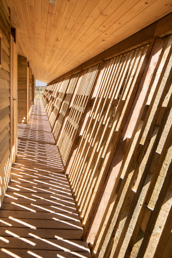 场地现状引导建筑视野朝向西侧。同时,另外三个方向则面临住户和邻居之间的隐私问题。出于对此的考虑,西、北、南三个方向的立面转变成被木栅格包围的半户外走廊,这创造出一个沟通室内室外环境的空间。