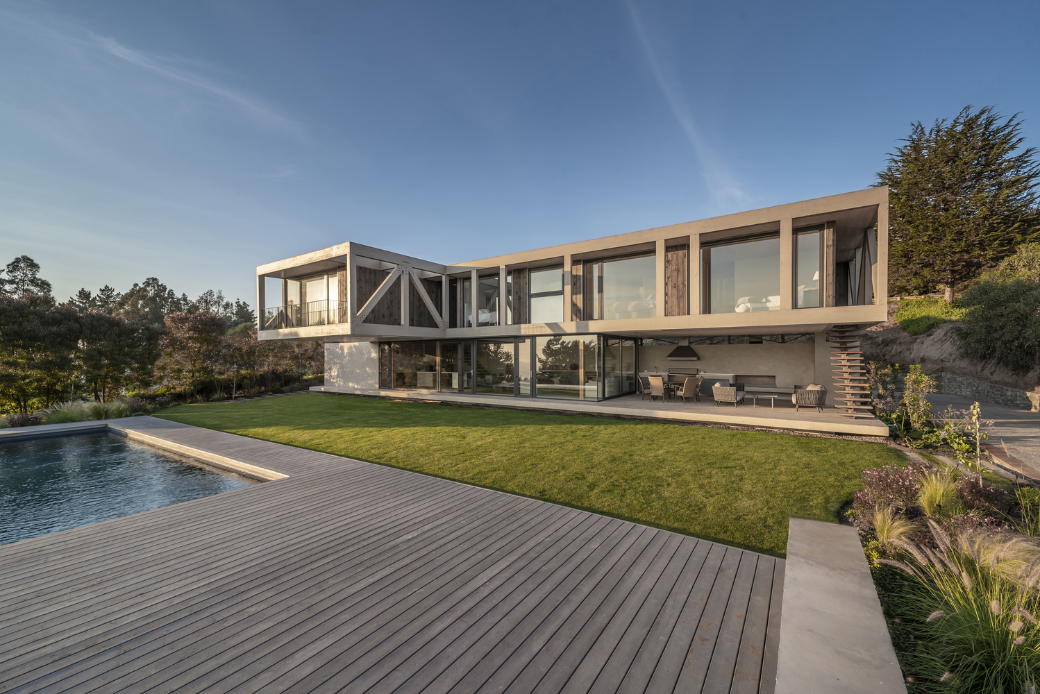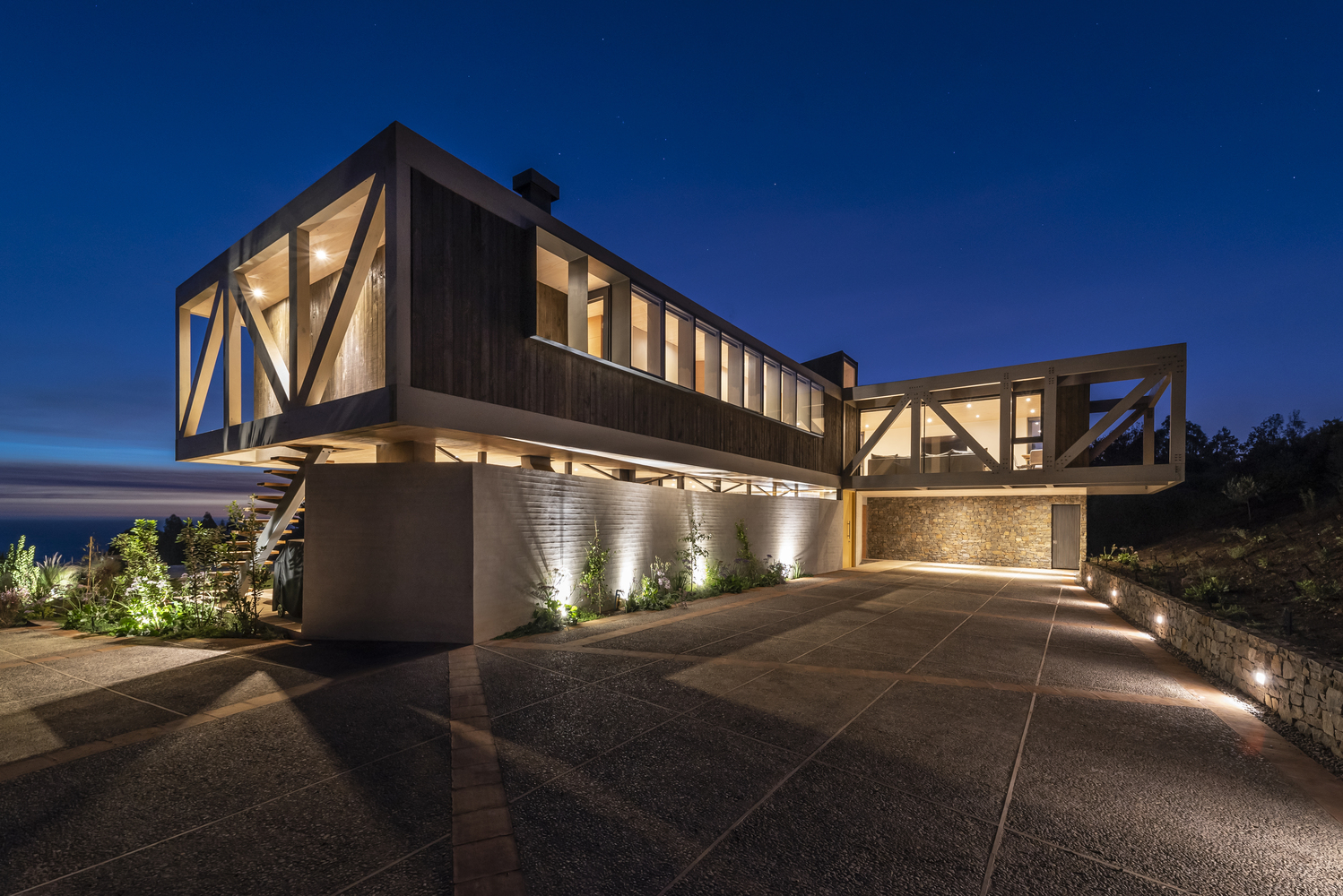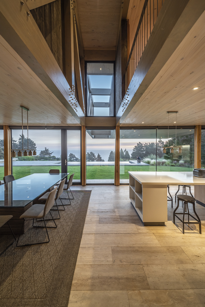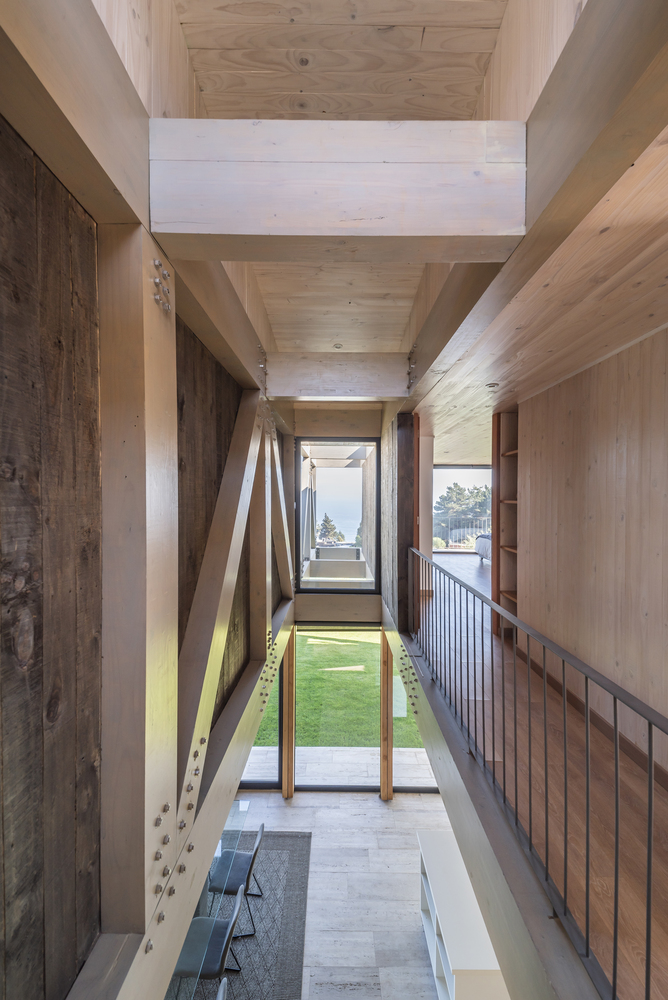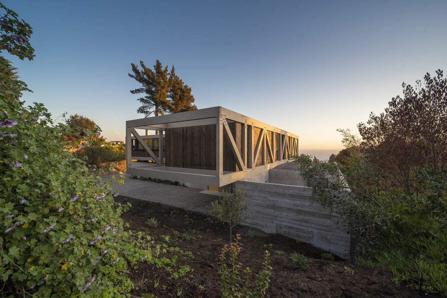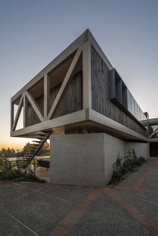 该建筑选址在智利中部的海岸附近,场地现状包括了一个陡峭的斜坡和一个高地。设计师要在这里设计一个独栋的住宅单元,他们选择了叠层松木作为建筑的结构骨架,该选择是因为松木在潮湿的盐碱气候中的所展现出来的适当的特性。