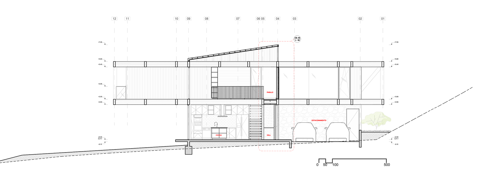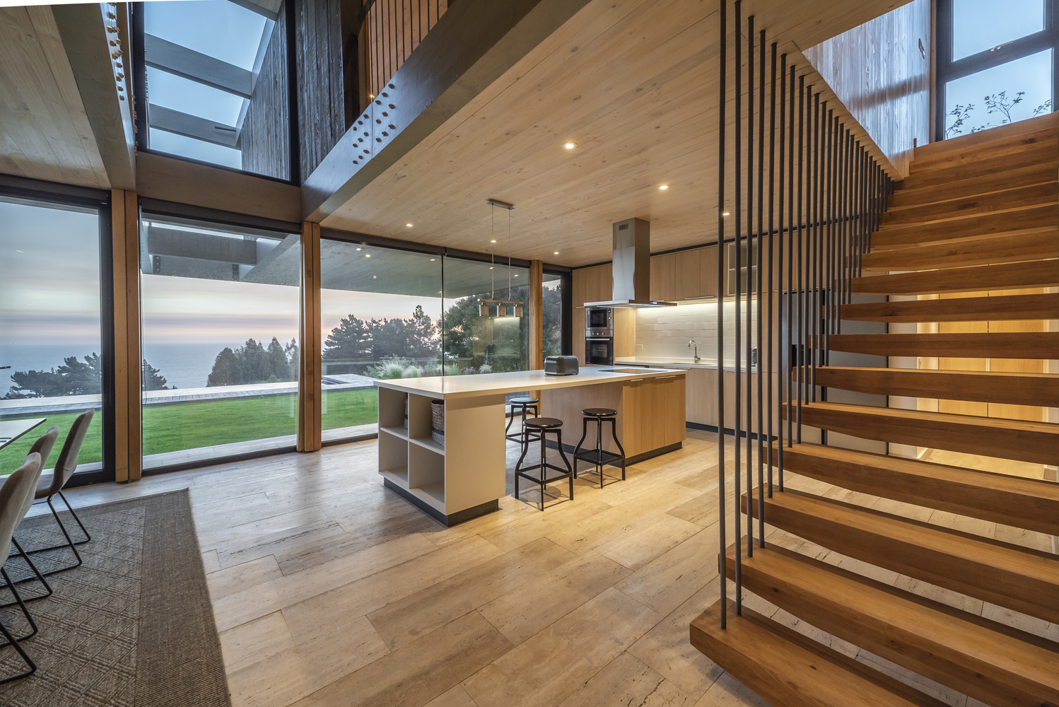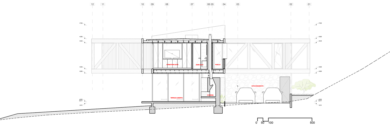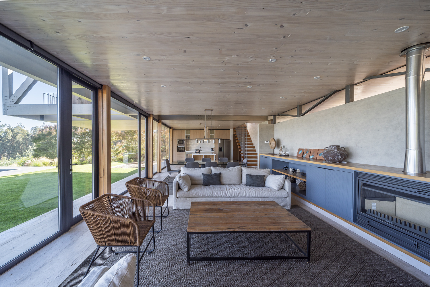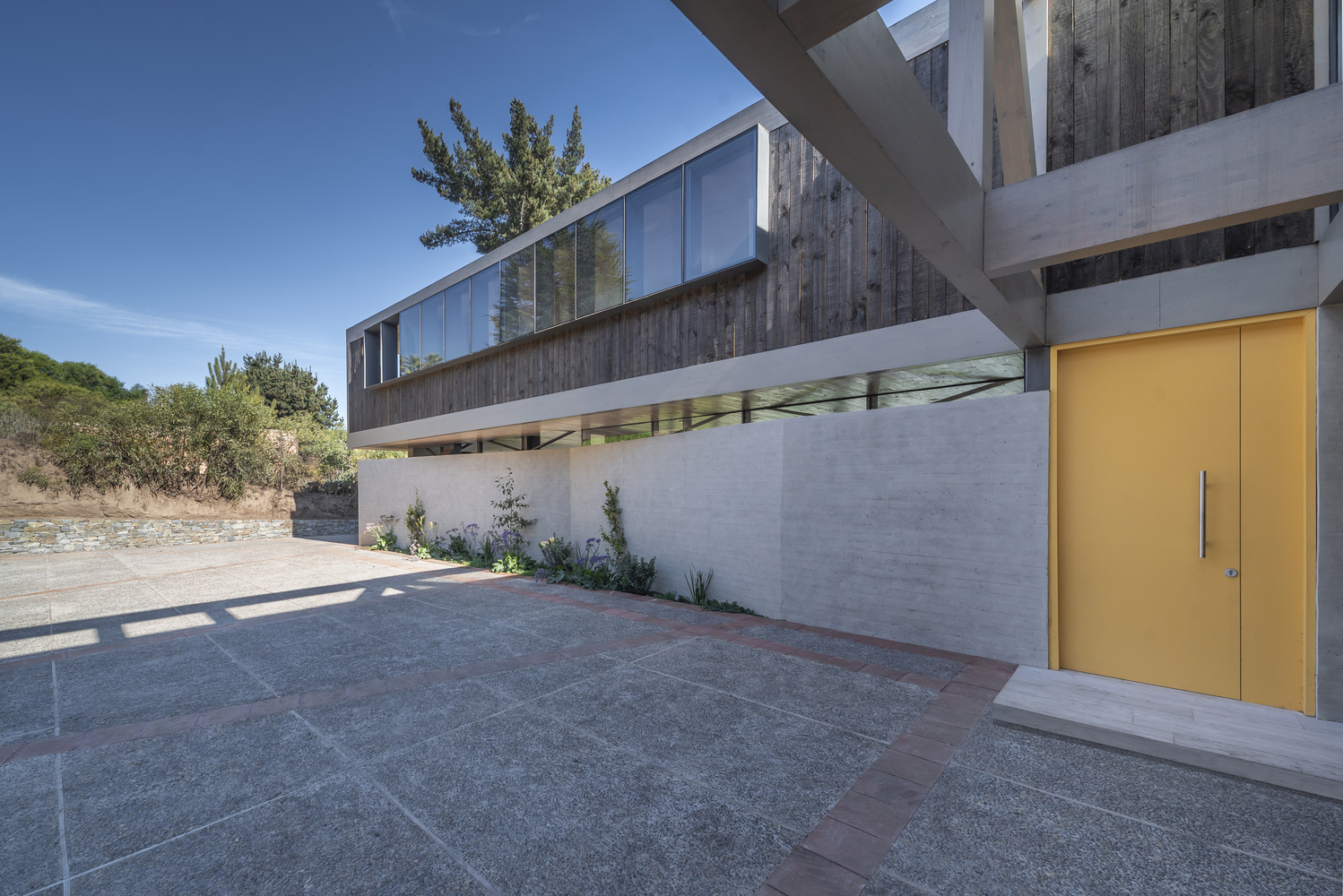 该建筑选址在智利中部的海岸附近,场地现状包括了一个陡峭的斜坡和一个高地。设计师要在这里设计一个独栋的住宅单元,他们选择了叠层松木作为建筑的结构骨架,该选择是因为松木在潮湿的盐碱气候中的所展现出来的适当的特性。
