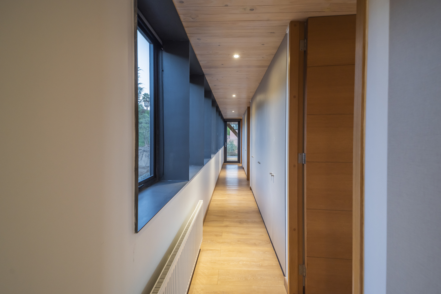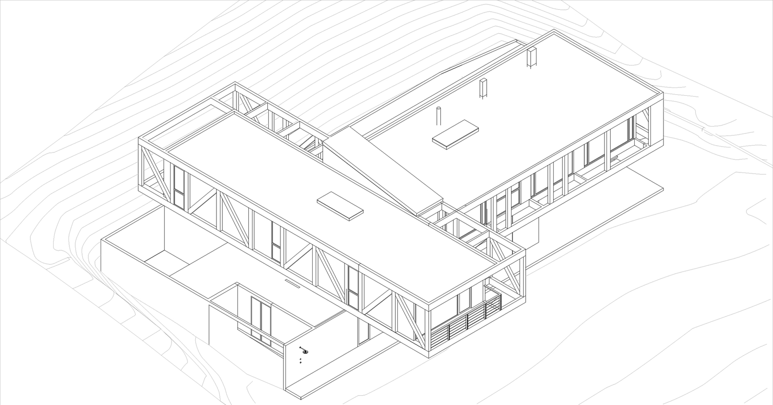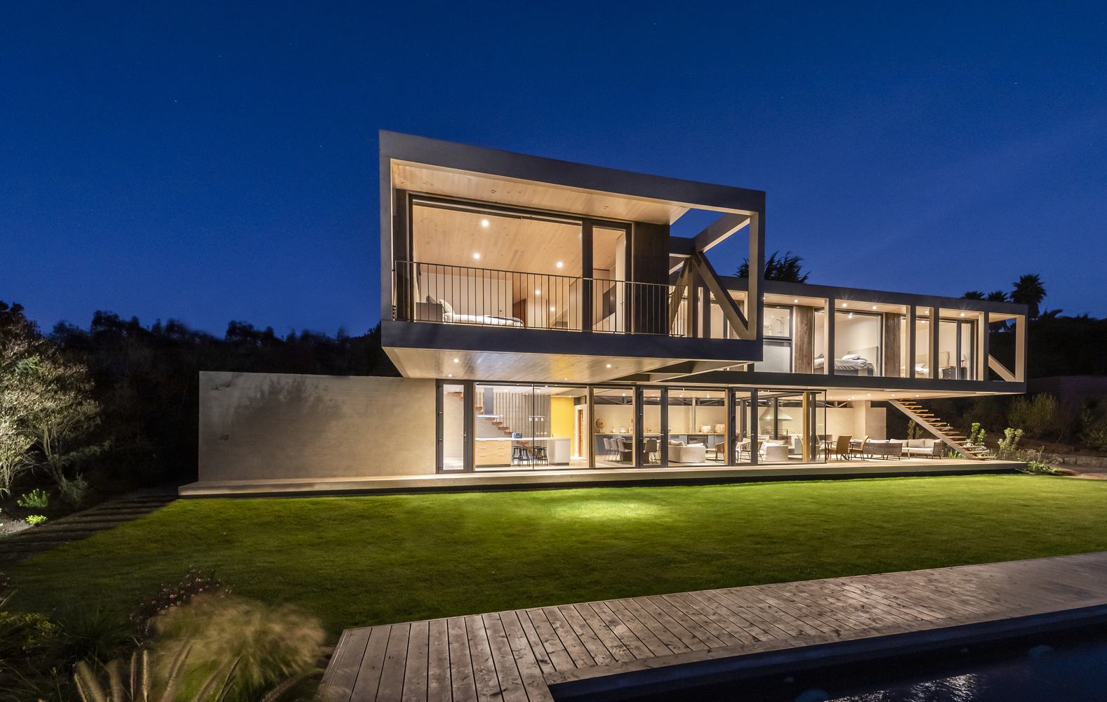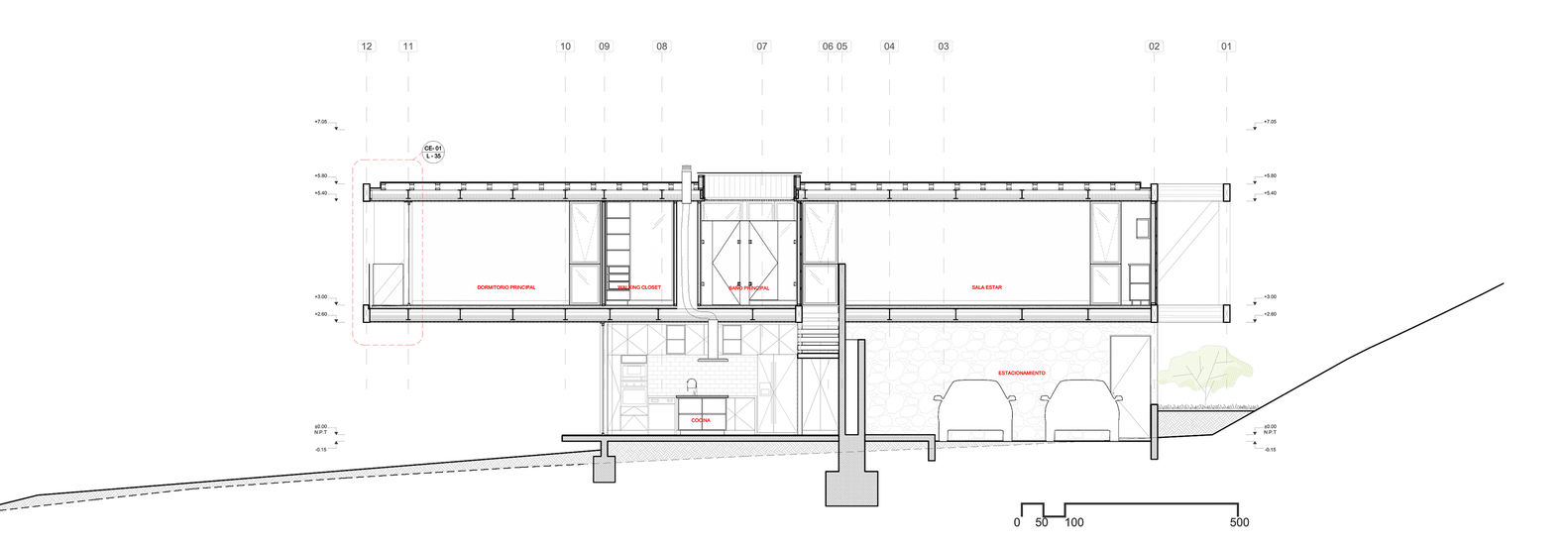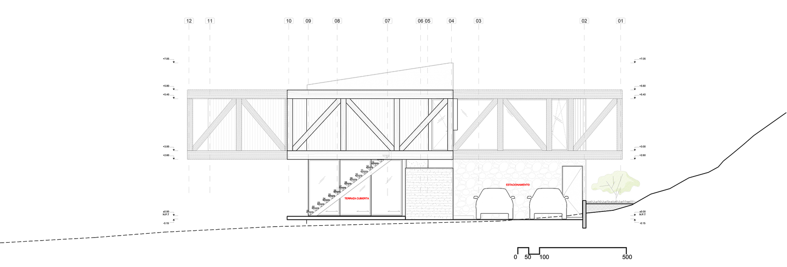 该建筑选址在智利中部的海岸附近,场地现状包括了一个陡峭的斜坡和一个高地。设计师要在这里设计一个独栋的住宅单元,他们选择了叠层松木作为建筑的结构骨架,该选择是因为松木在潮湿的盐碱气候中的所展现出来的适当的特性。