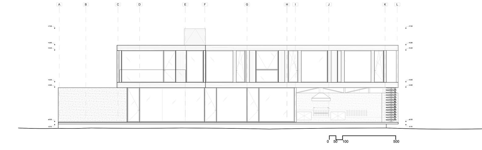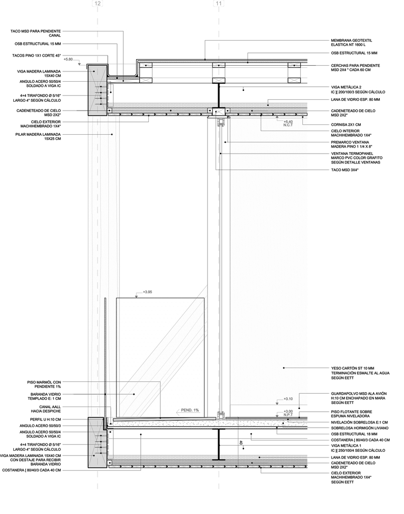 原则上讲,两个体块交叉处的上层框架的边缘是由横截面为40x15 cm的叠片框架制成的,该框架以交叉的形式相互支持以来满足结构需要,这样一来,就能够在建筑中引入更多的灯线。
