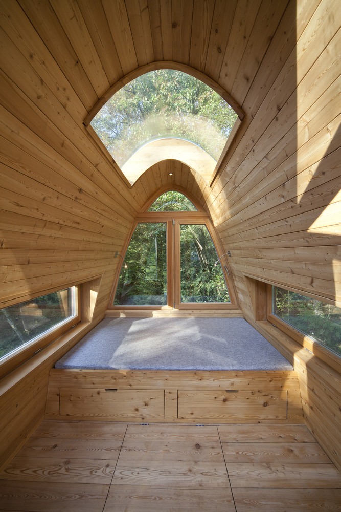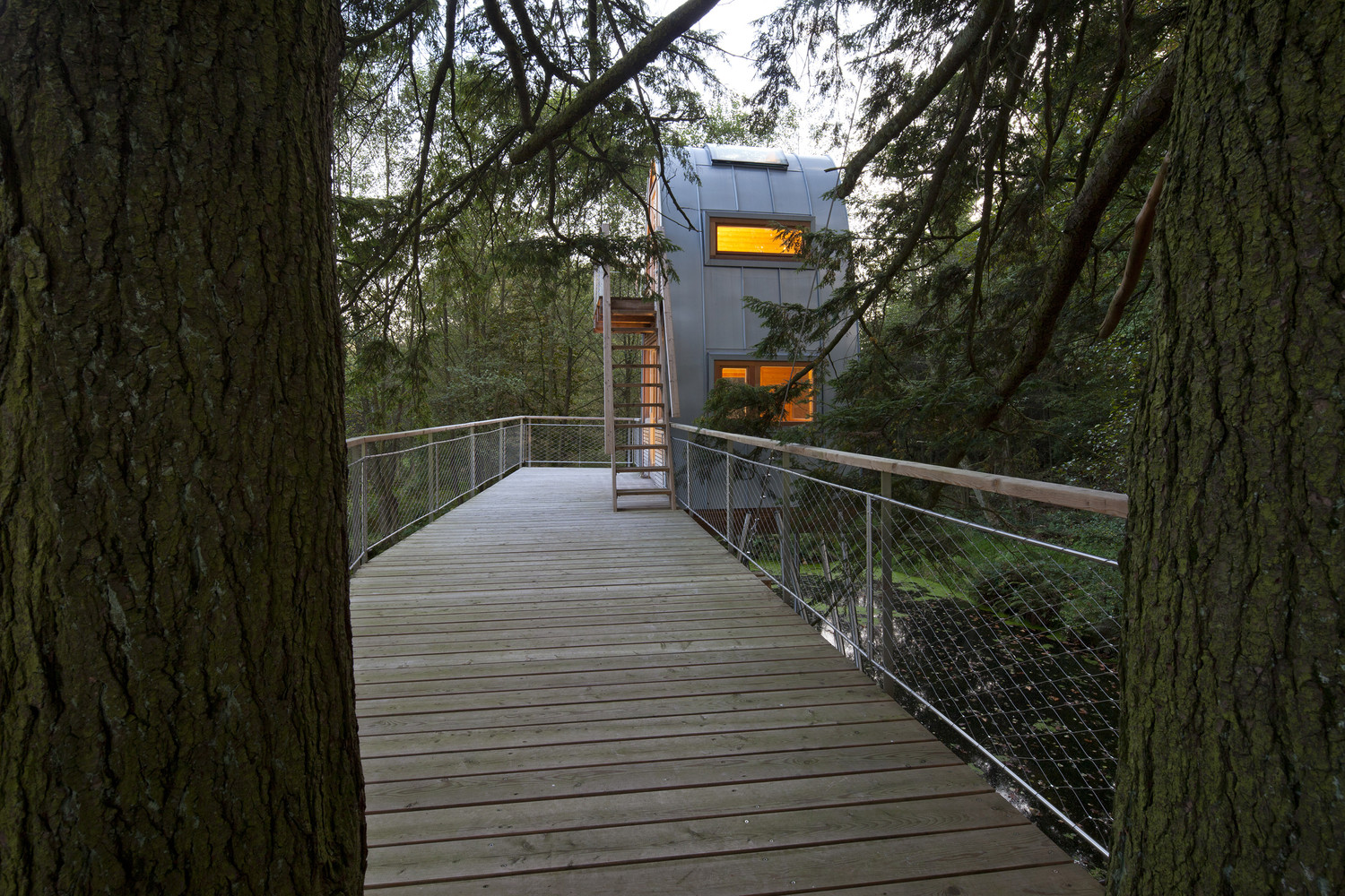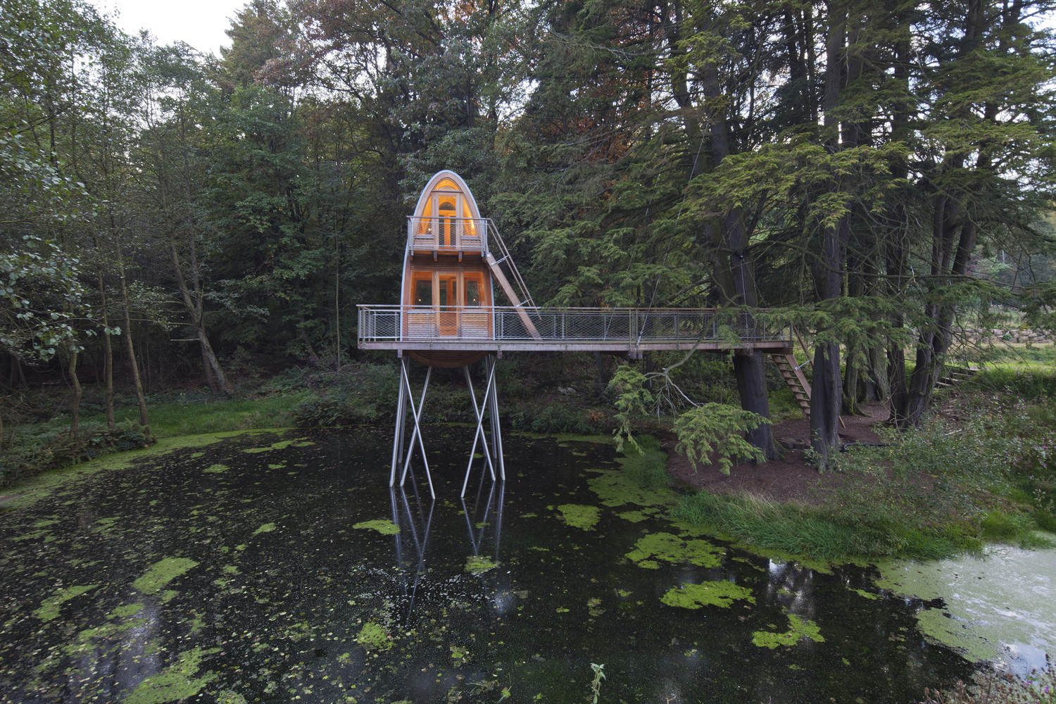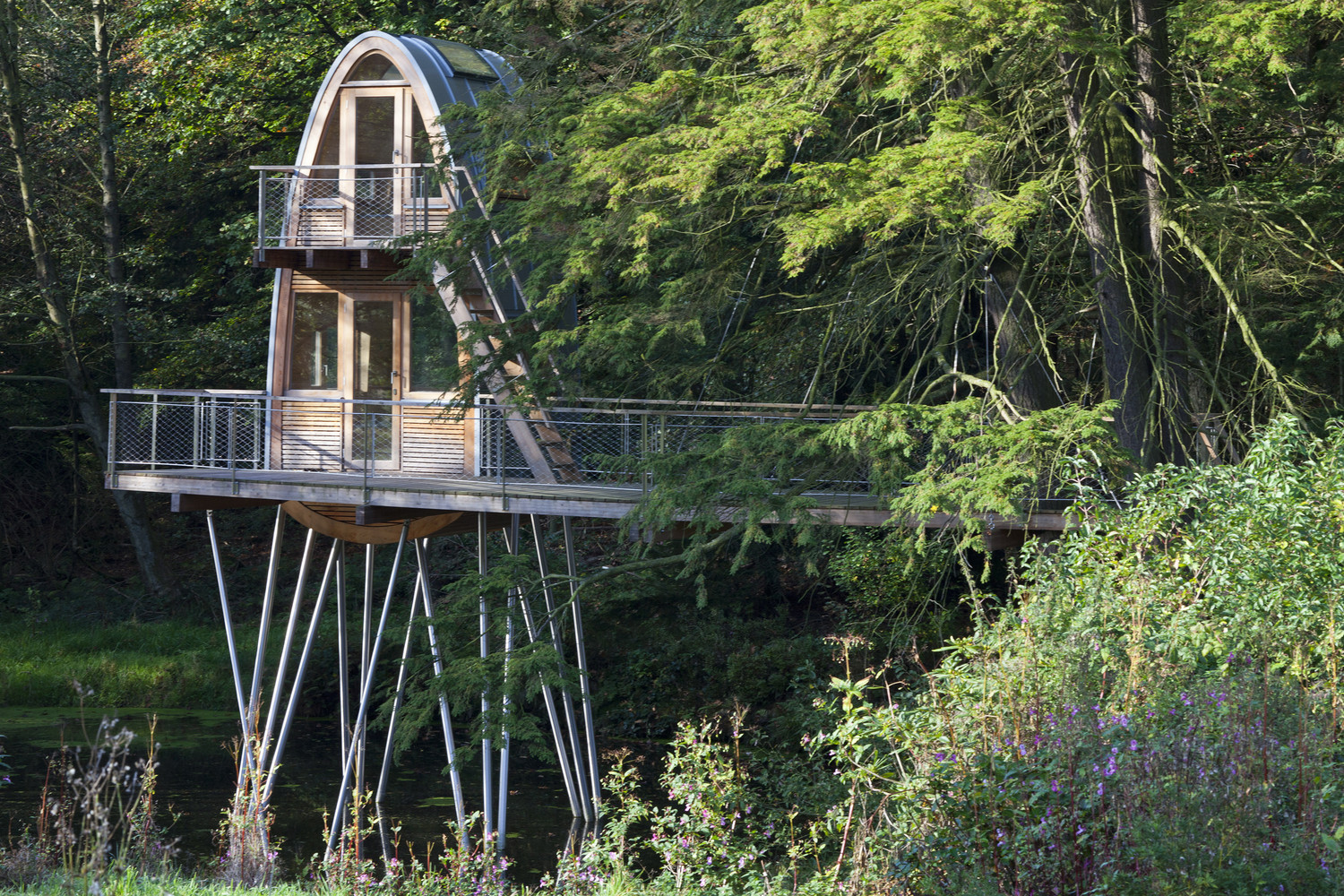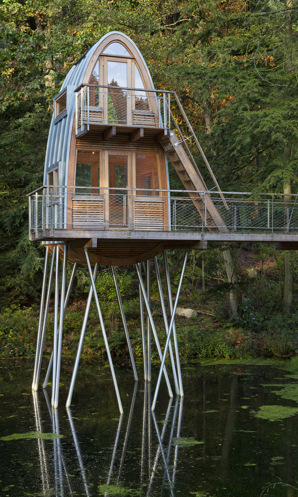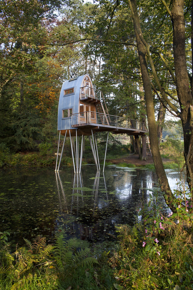 树屋是通过水边的楼梯通到平台而进入的。两棵穿过平台的树做出了欢迎游客来访树屋的姿态。从这个角度来看,这个用松木制作的狭窄的甲板就好像漂浮在池塘的水面上,一直通到圆形的树屋塔。在这里,游客可以选择从底层进入房间,亦可以从外部楼梯到达上层的卧室。