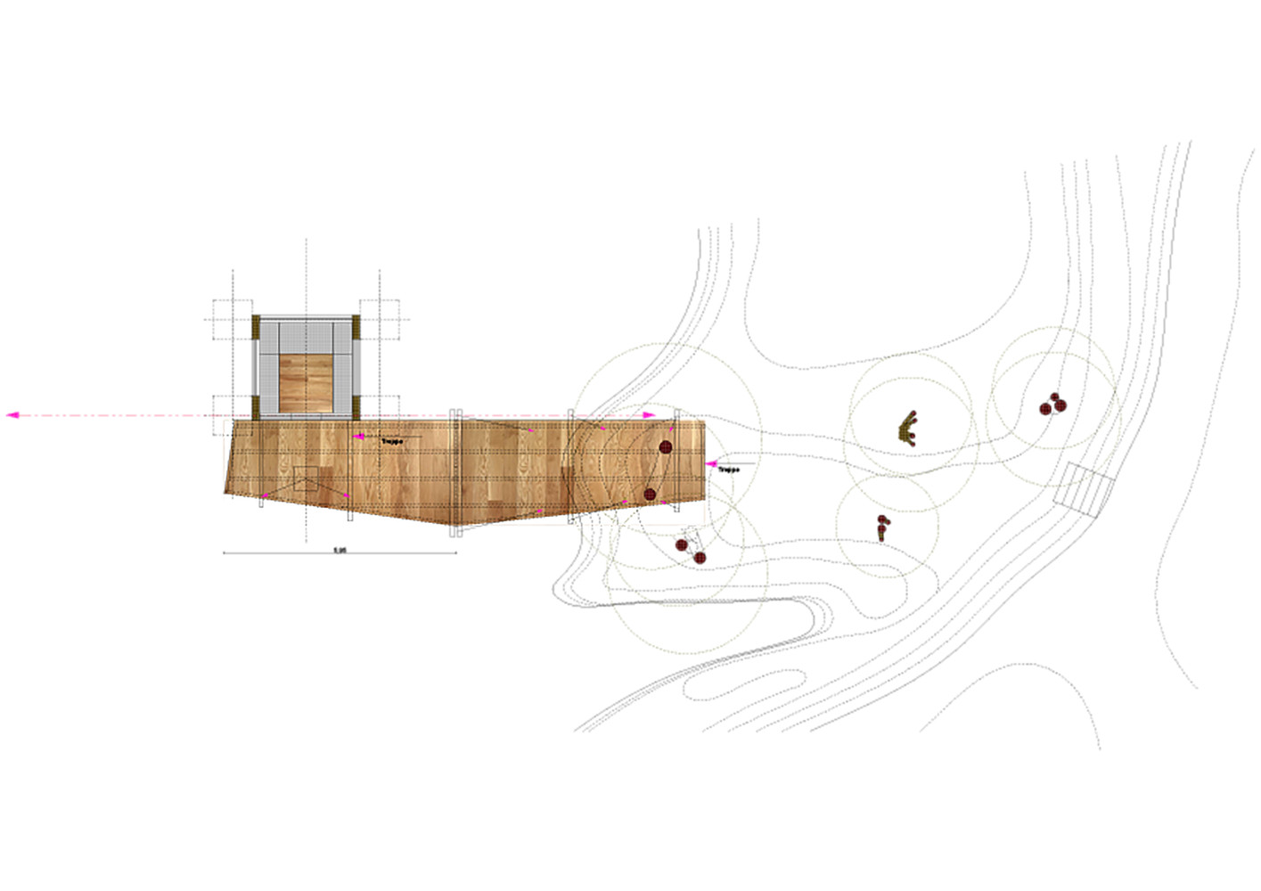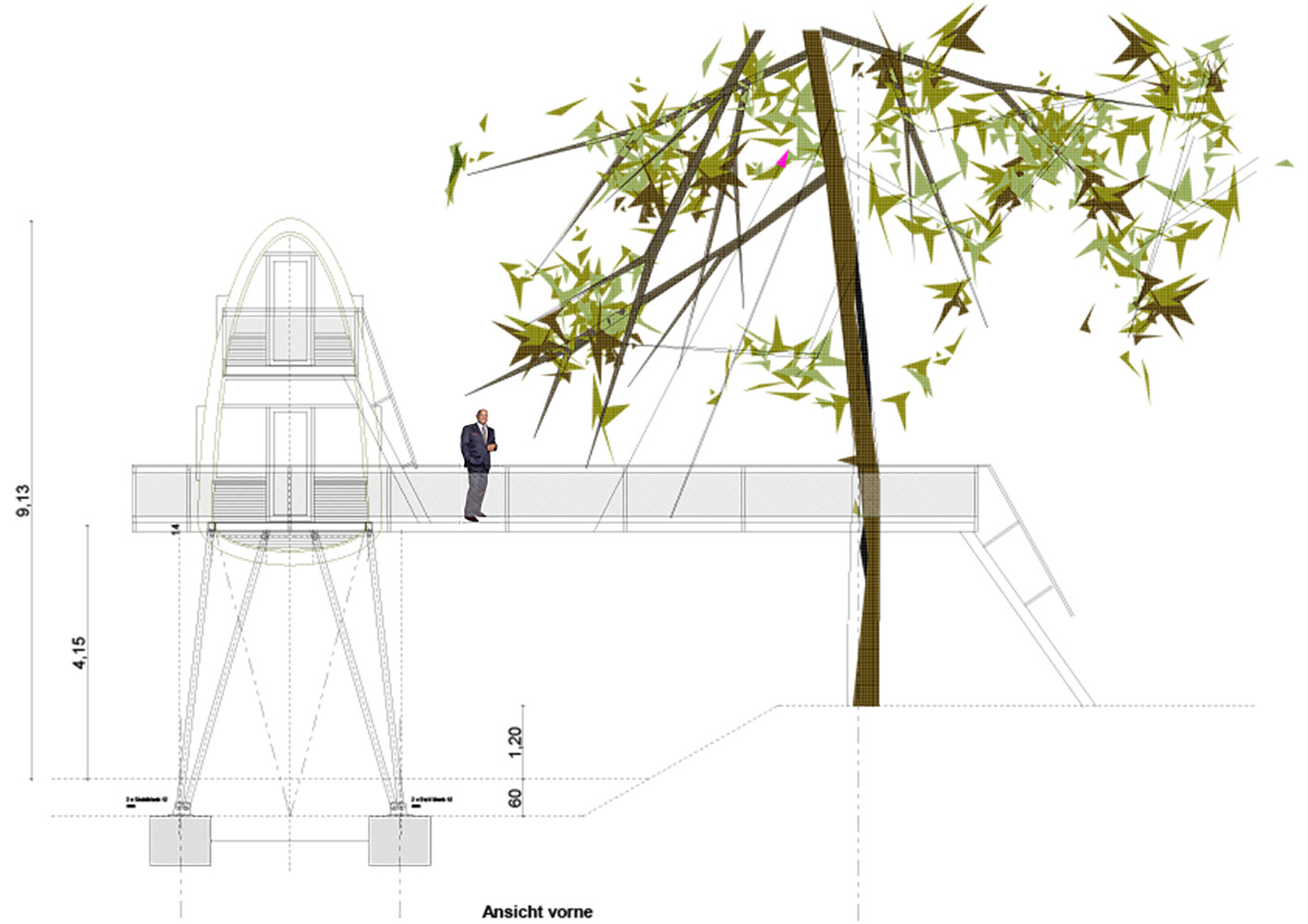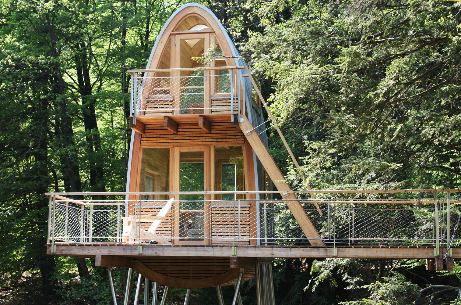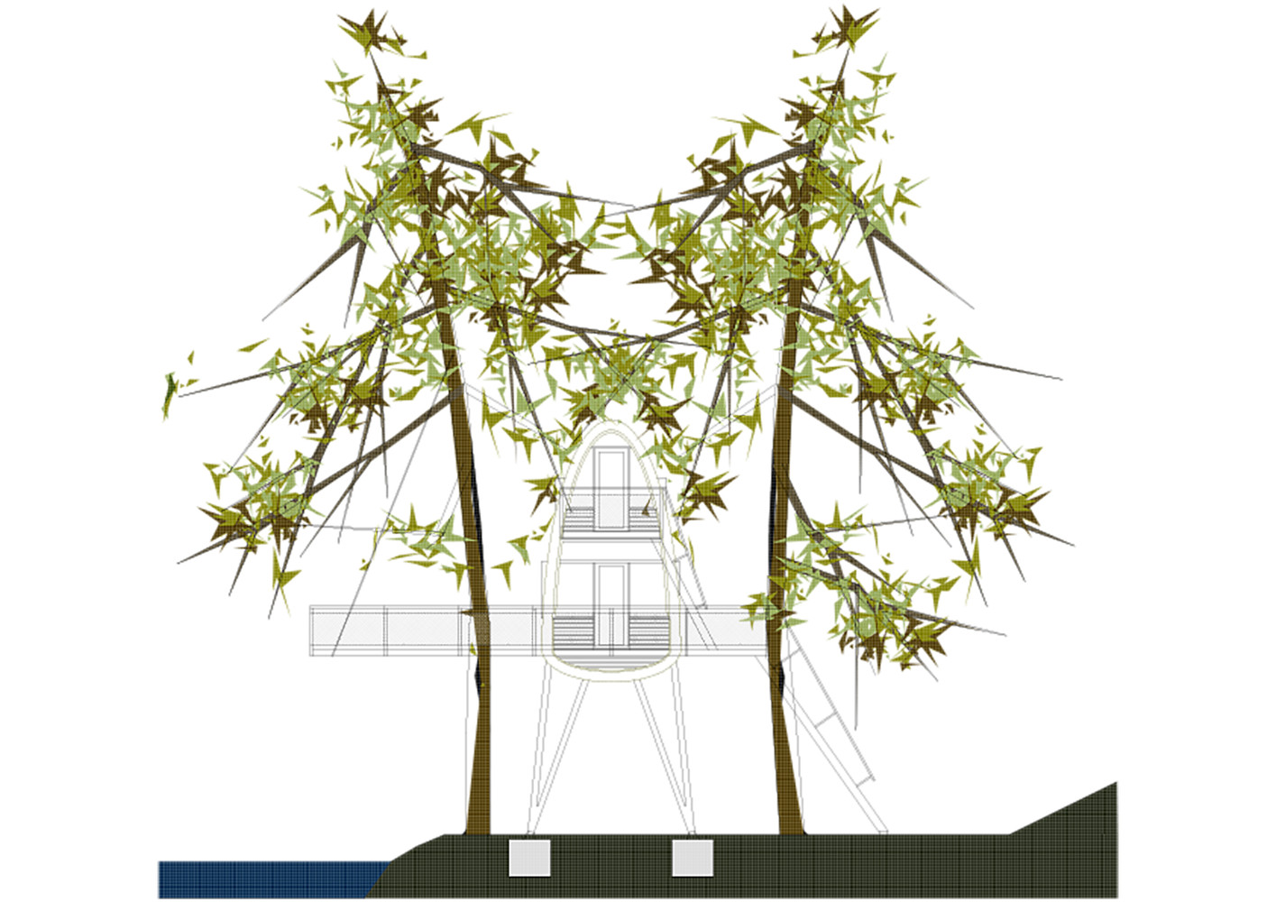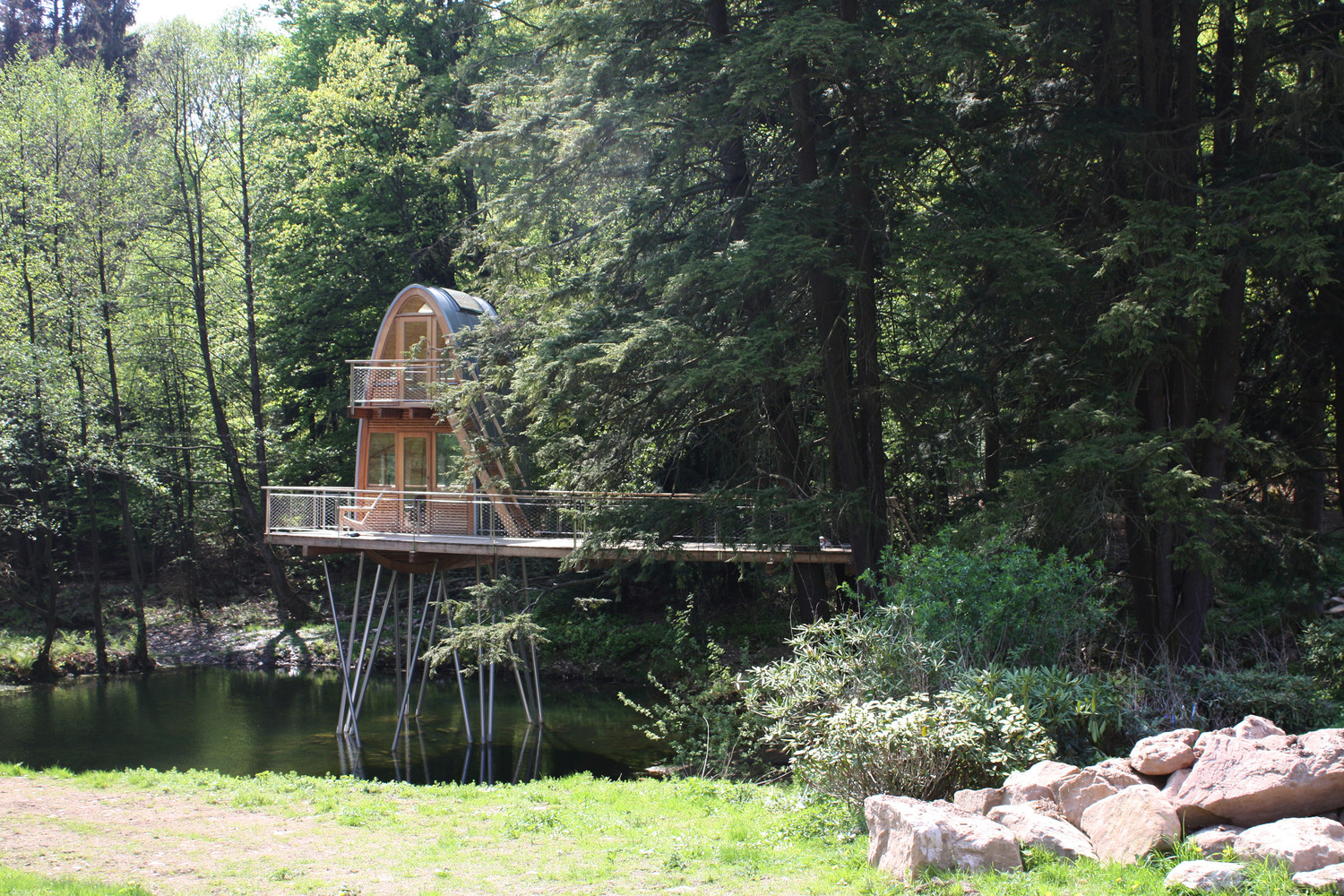 树屋是通过水边的楼梯通到平台而进入的。两棵穿过平台的树做出了欢迎游客来访树屋的姿态。从这个角度来看,这个用松木制作的狭窄的甲板就好像漂浮在池塘的水面上,一直通到圆形的树屋塔。在这里,游客可以选择从底层进入房间,亦可以从外部楼梯到达上层的卧室。