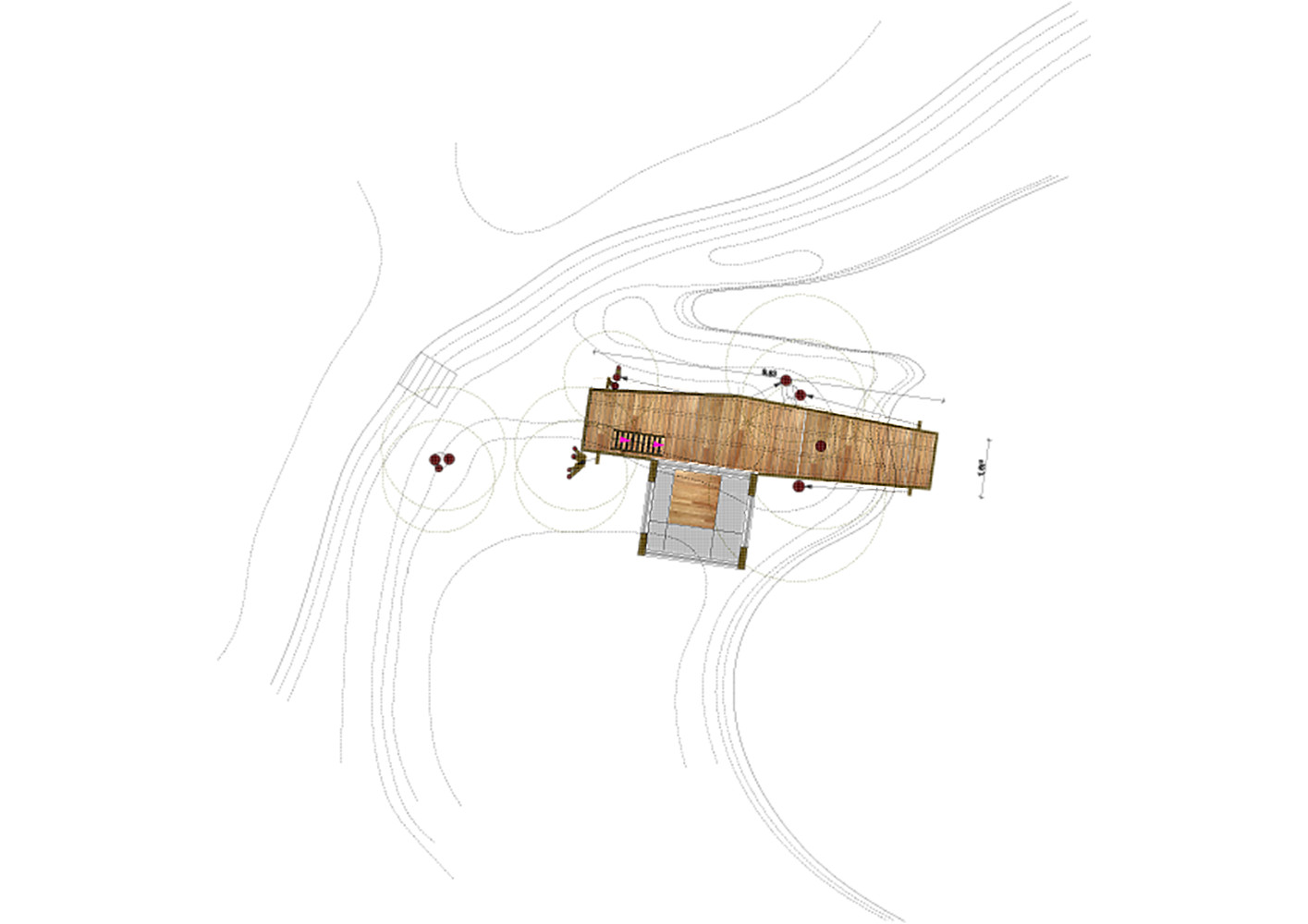 在两个池塘下边的一棵挺拔的铁杉处就是选定的树屋的位置,很快,设计师就决定在池塘里设计一个两层楼的树屋塔,并通过一条长长平台将它与铁杉连接在一起。