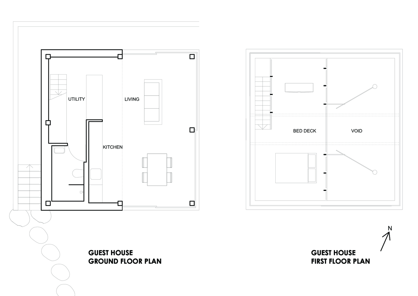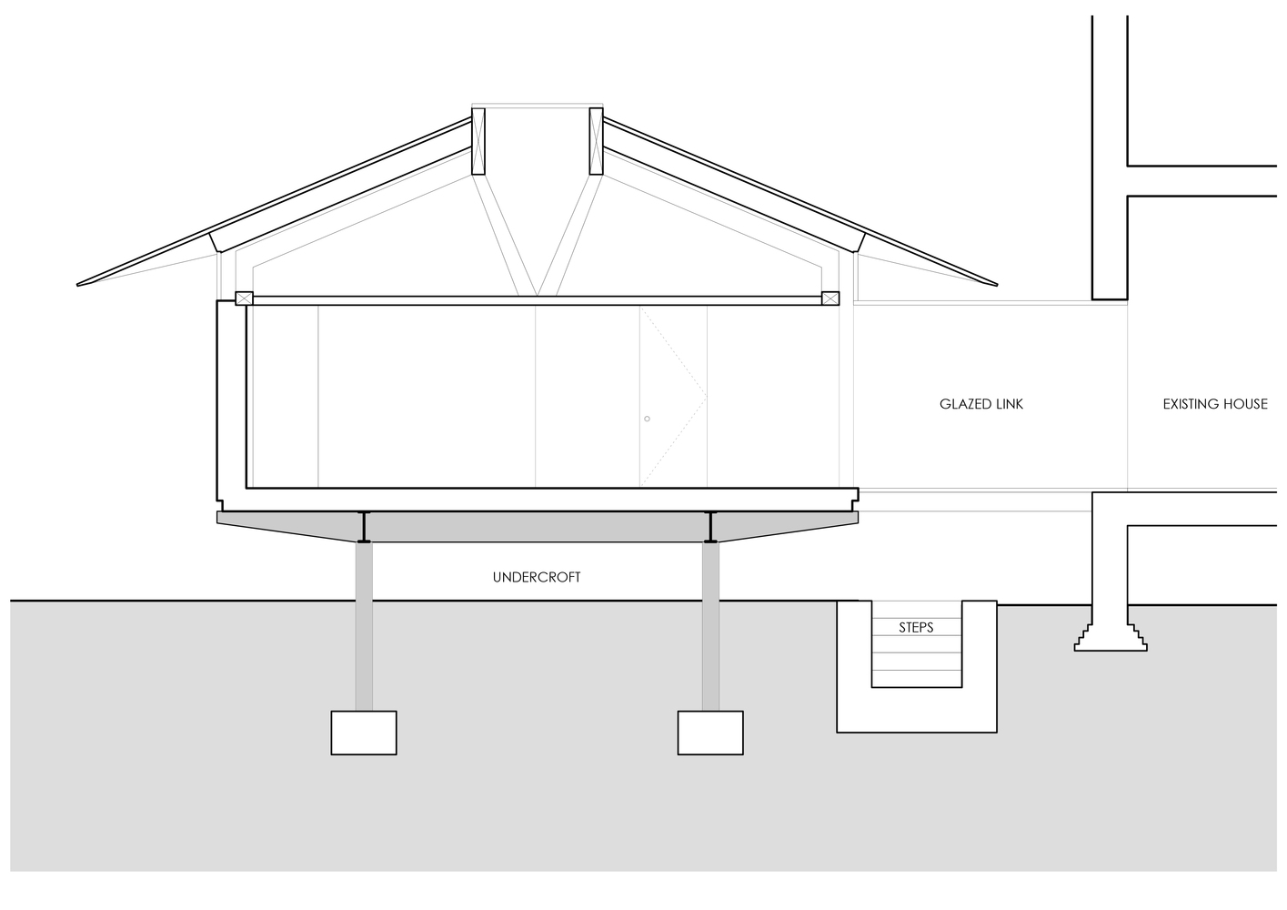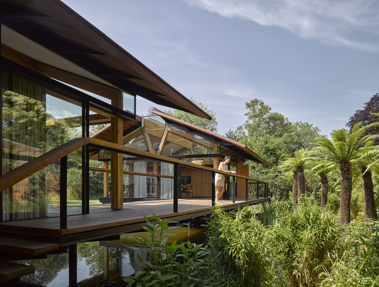 两栋新建筑中较小的一栋是一个独立的客房,附有厨房/起居空间、公用走廊、浴室和床铺。较大的建筑作为主要生活空间,也包含一个浴室和床铺。该设计通过一座玻璃桥结构与现有建筑相连接。这两座建筑都可以互相“打开”,因为其底层架空的玻璃被设计滑动且可打开的门板。