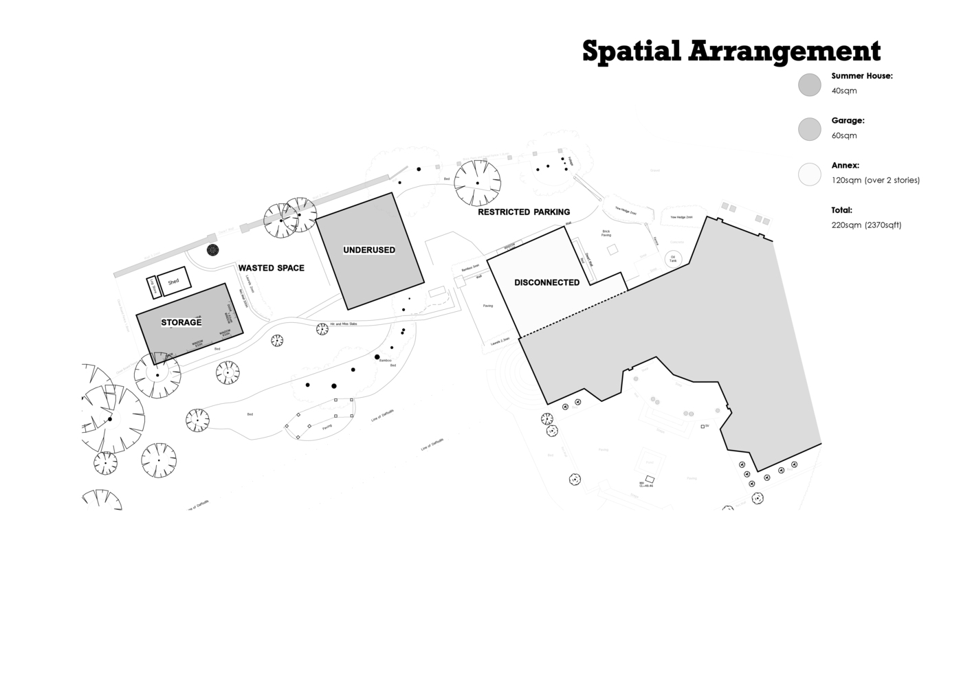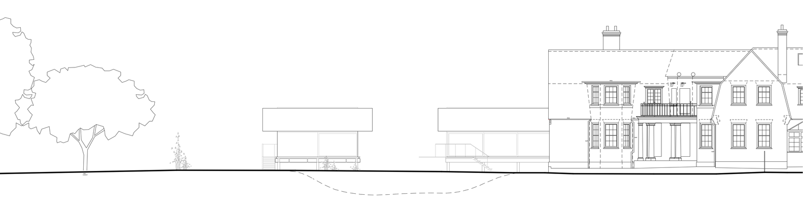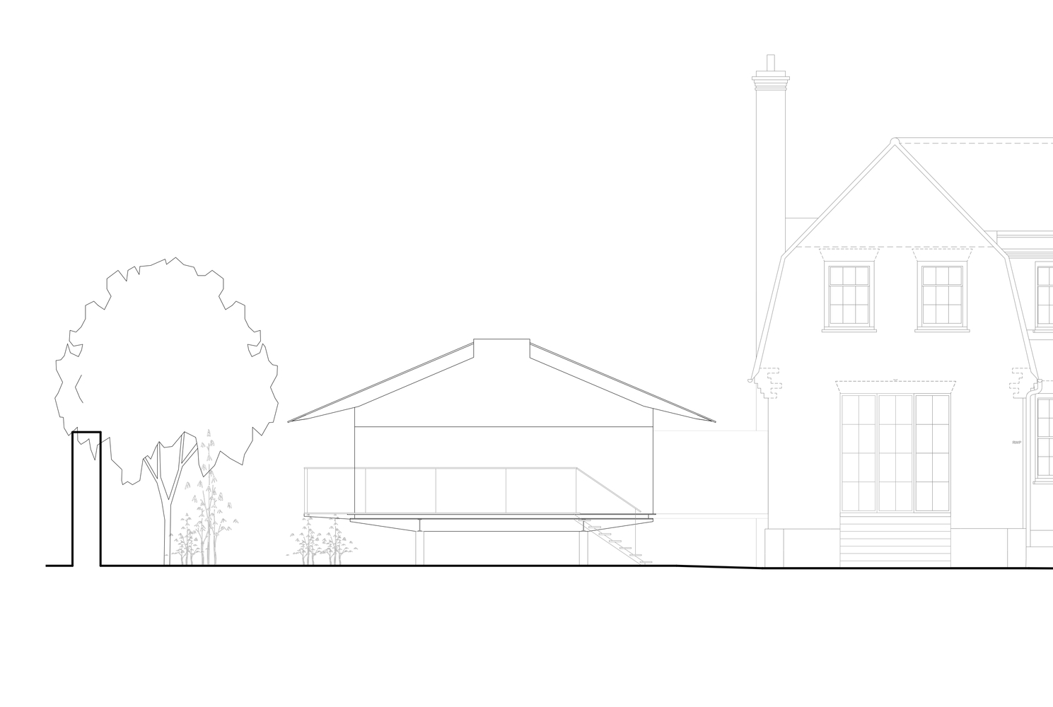 两栋新建筑中较小的一栋是一个独立的客房,附有厨房/起居空间、公用走廊、浴室和床铺。较大的建筑作为主要生活空间,也包含一个浴室和床铺。该设计通过一座玻璃桥结构与现有建筑相连接。这两座建筑都可以互相“打开”,因为其底层架空的玻璃被设计滑动且可打开的门板。