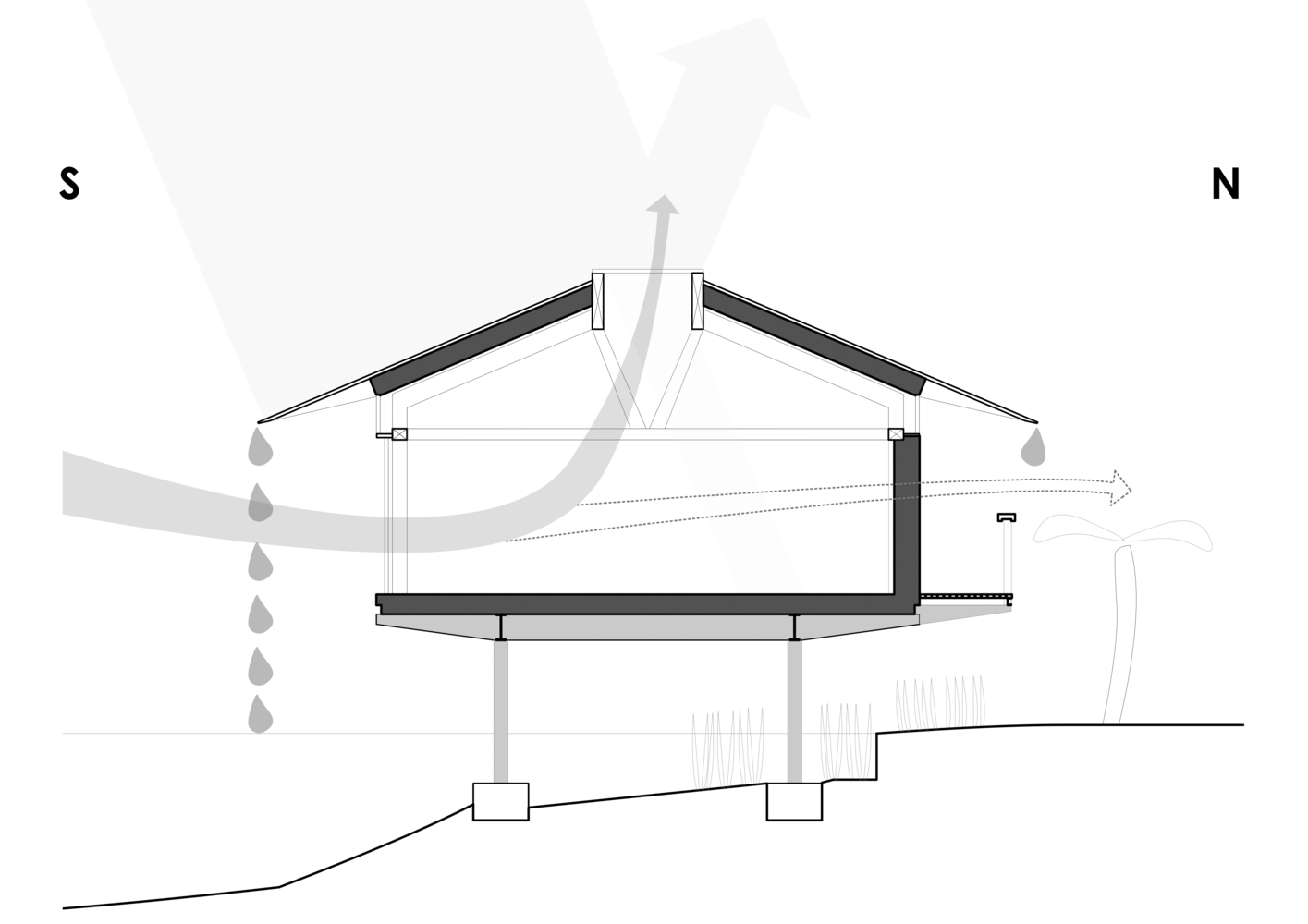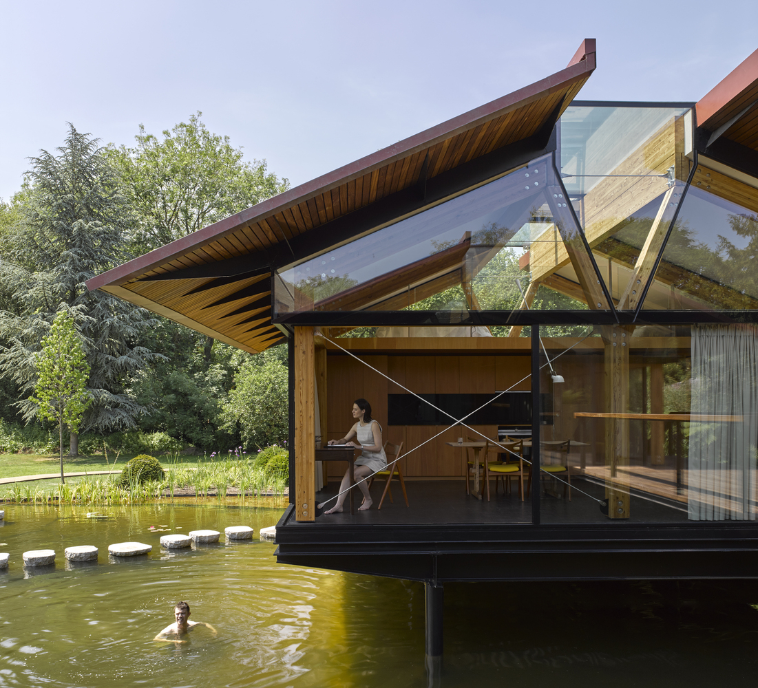 建筑师将湖面上的建筑架空,使其免受洪水的侵扰,同时又可以在现有建筑的底层游泳。该设计的主要特征是屋顶及其1.5米的悬挑屋檐,在夏季为室内提供遮阳,同时提供一个由内而外融合的遮阴走道。