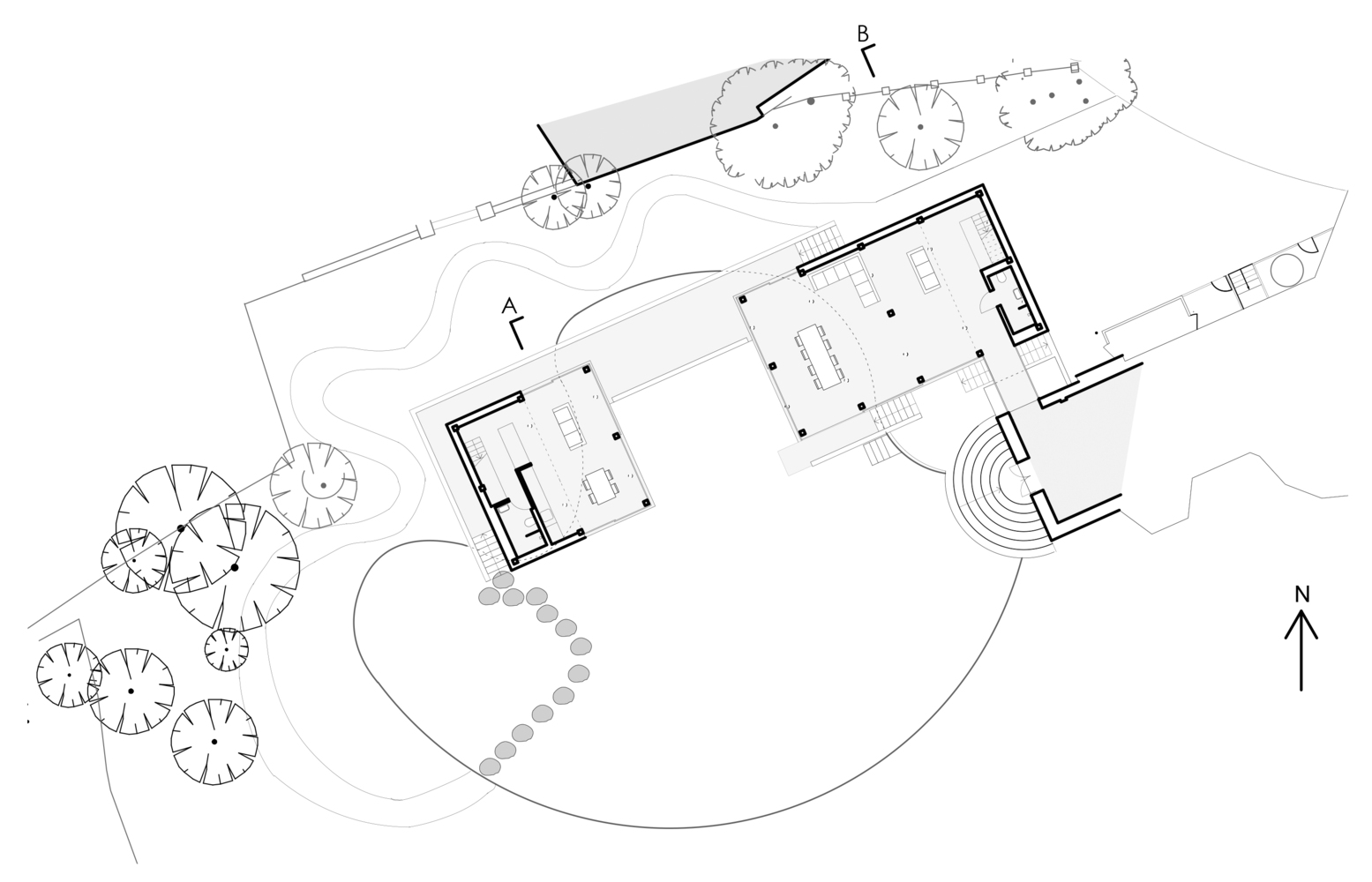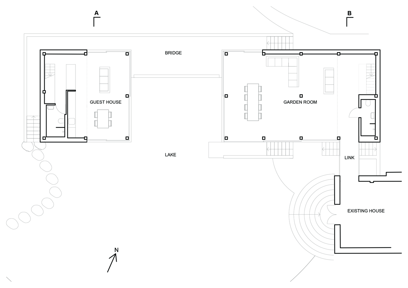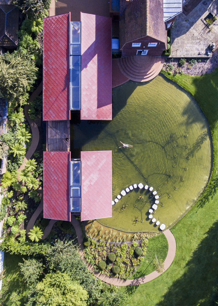 建筑师的景观设计是建筑与周围环境相融合这一概念中不可或缺的元素,其设计包括游泳池以及环绕建筑的环形路线。从前区停车场,到一条蜿蜒小路穿过由大型蕨类植物组成的隐蔽花园,最终通向跨过湖面的Stepping Stone住宅。这些石头与高架走道和桥梁相连接。