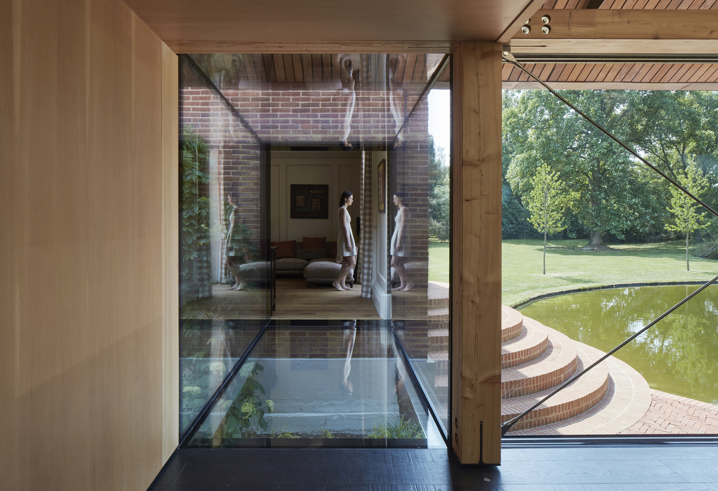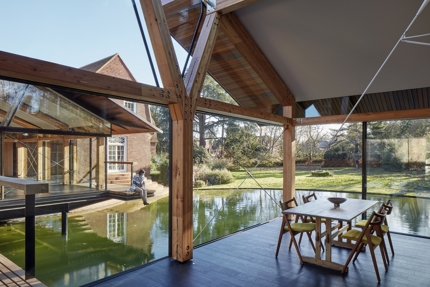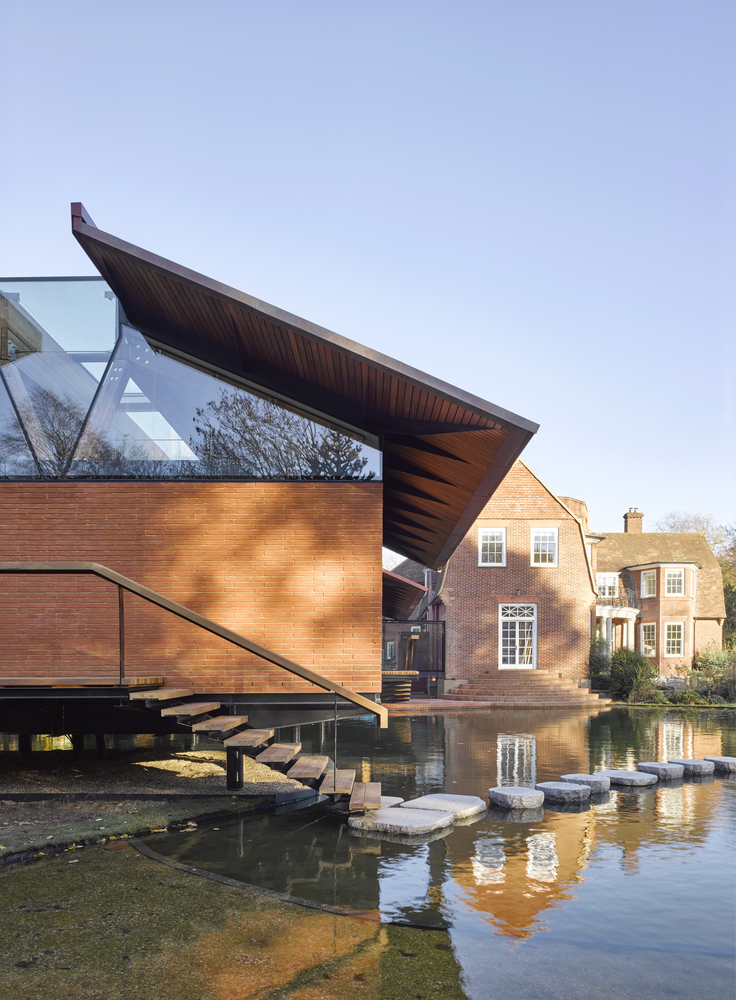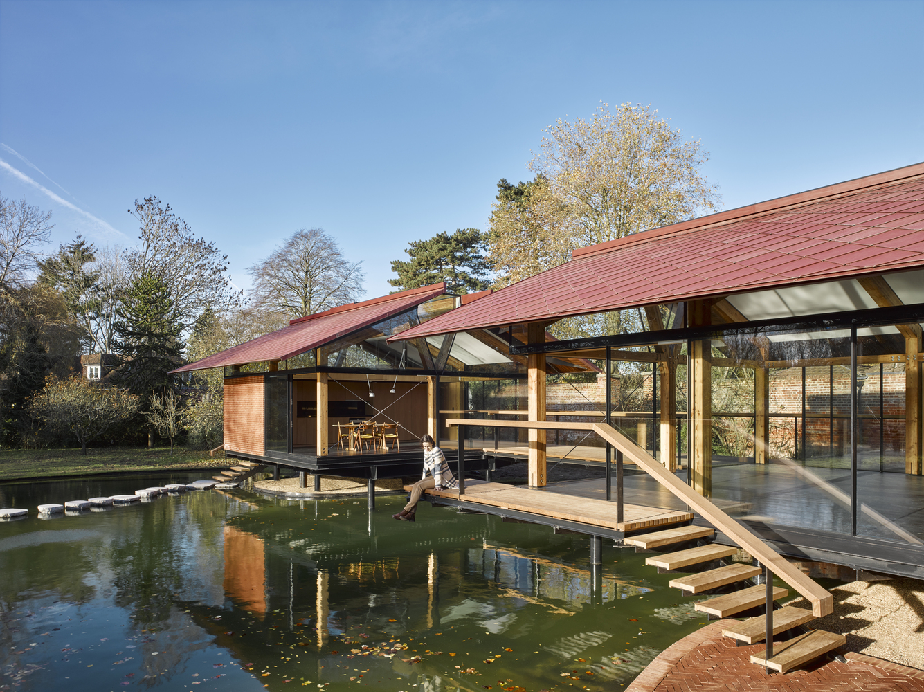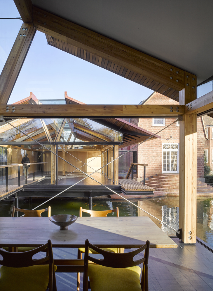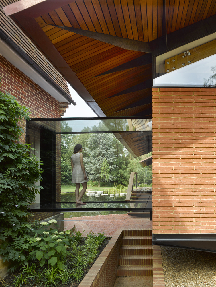 硬木材质的宽扶手、甲板和屋顶檐口为这些空间创造出温暖的触感。同时,建筑师采用砖与现有的庄园住宅相联系,营造出整体、直线形且轻松漂浮在水面上的印象。建筑师尤其选用了较长的砖块尺寸以强调新建筑的水平性。