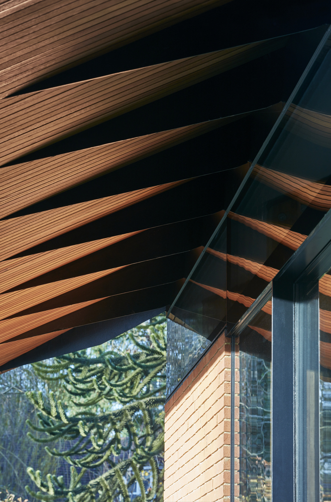 由于其精确的工程设计和稳定的质量,建筑师选用了胶合木板,该材料是钢框架和定制玻璃系统的理想搭档,两者之间产生的误差最小。落叶松的胶合木板主要用于内部,再加上道格拉斯冷杉胶合板镶板,为室内营造出温暖的氛围,中央的“Y”形柱成为空间的焦点。“Y”形分裂在上部支持中央屋顶灯光,该照明设施贯穿了整栋建筑,从而将屋顶分开,并向天空开放。预氧化的钻石铜屋顶瓦采用庄园使用的粘土屋顶瓦,为新建筑提供了独特的特点。可锻铜形成了定制的边缘细节,使屋顶屋檐具有足够锋利。