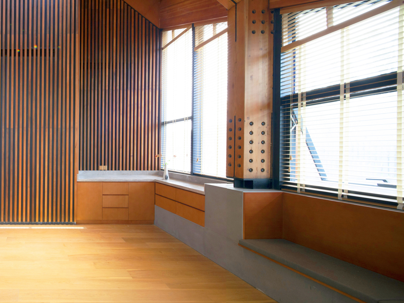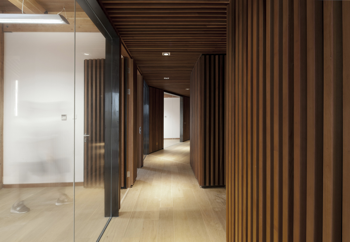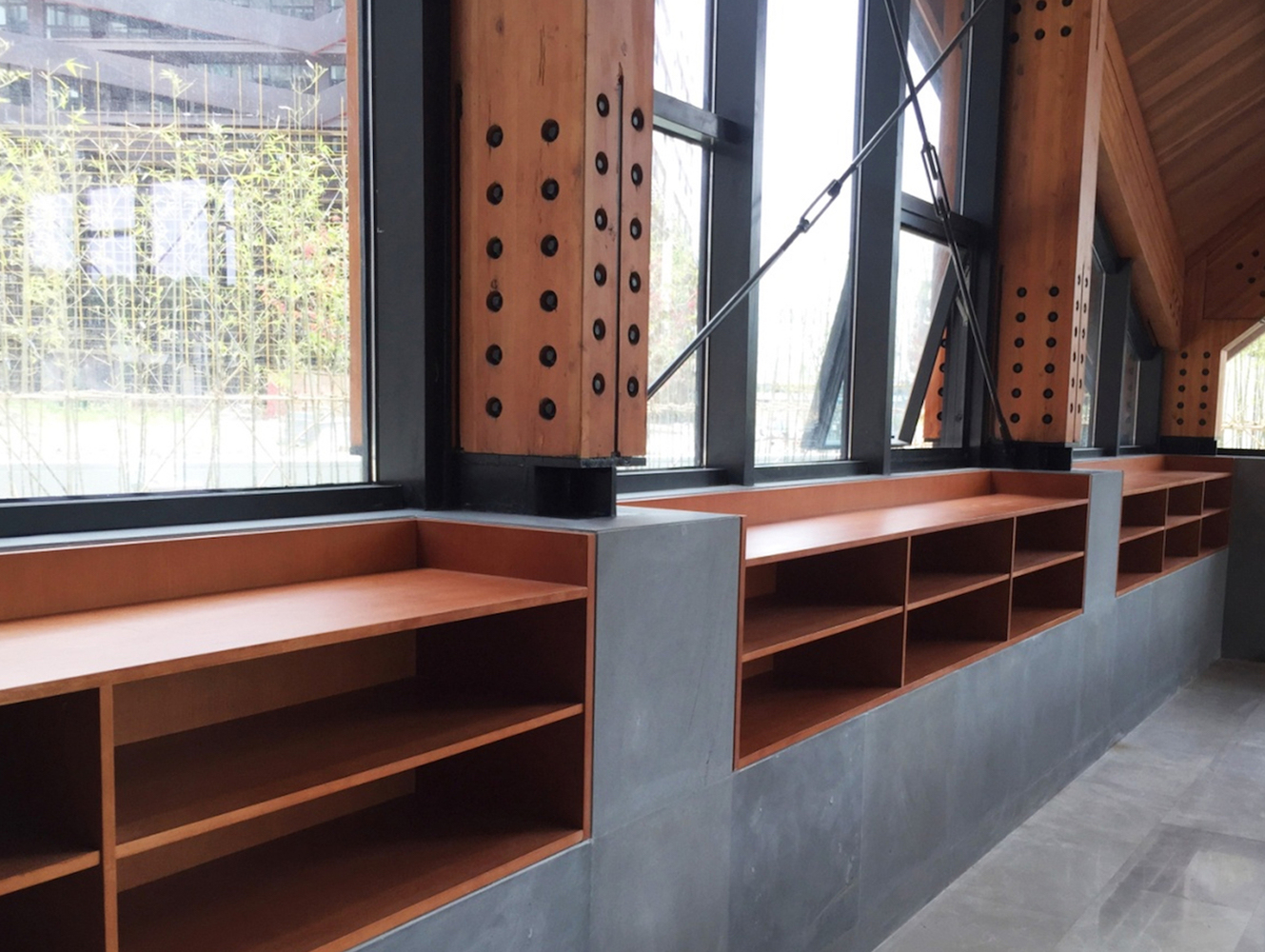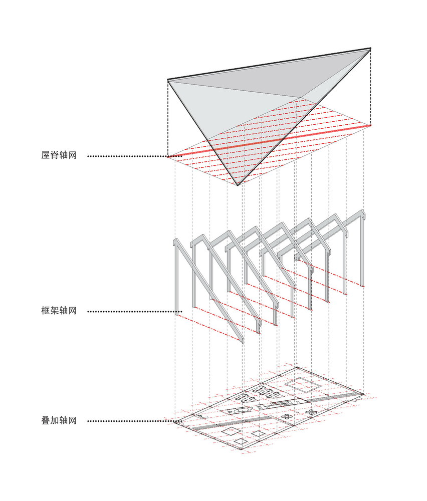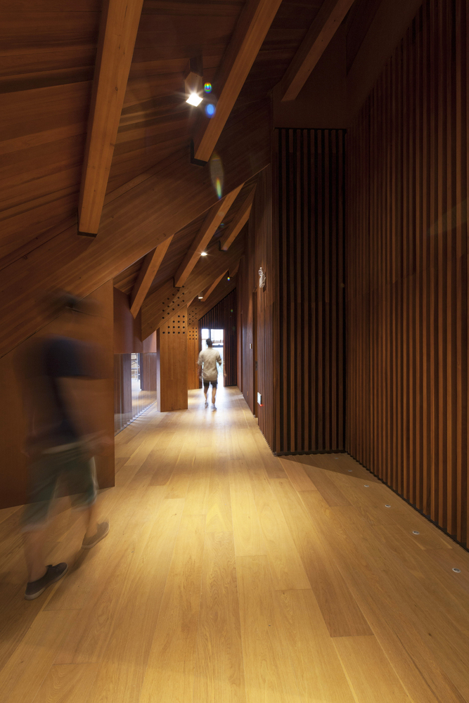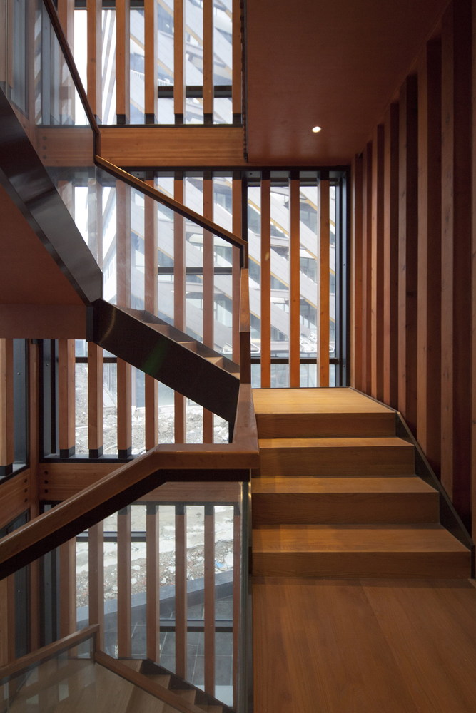 平行的木排架承担着竖向的受力,中央部分的混凝土核心则担负着水平向的受力。整个核心结构通过楼梯、卫生间、设备用房的设置,被处理成一部精巧的机器。