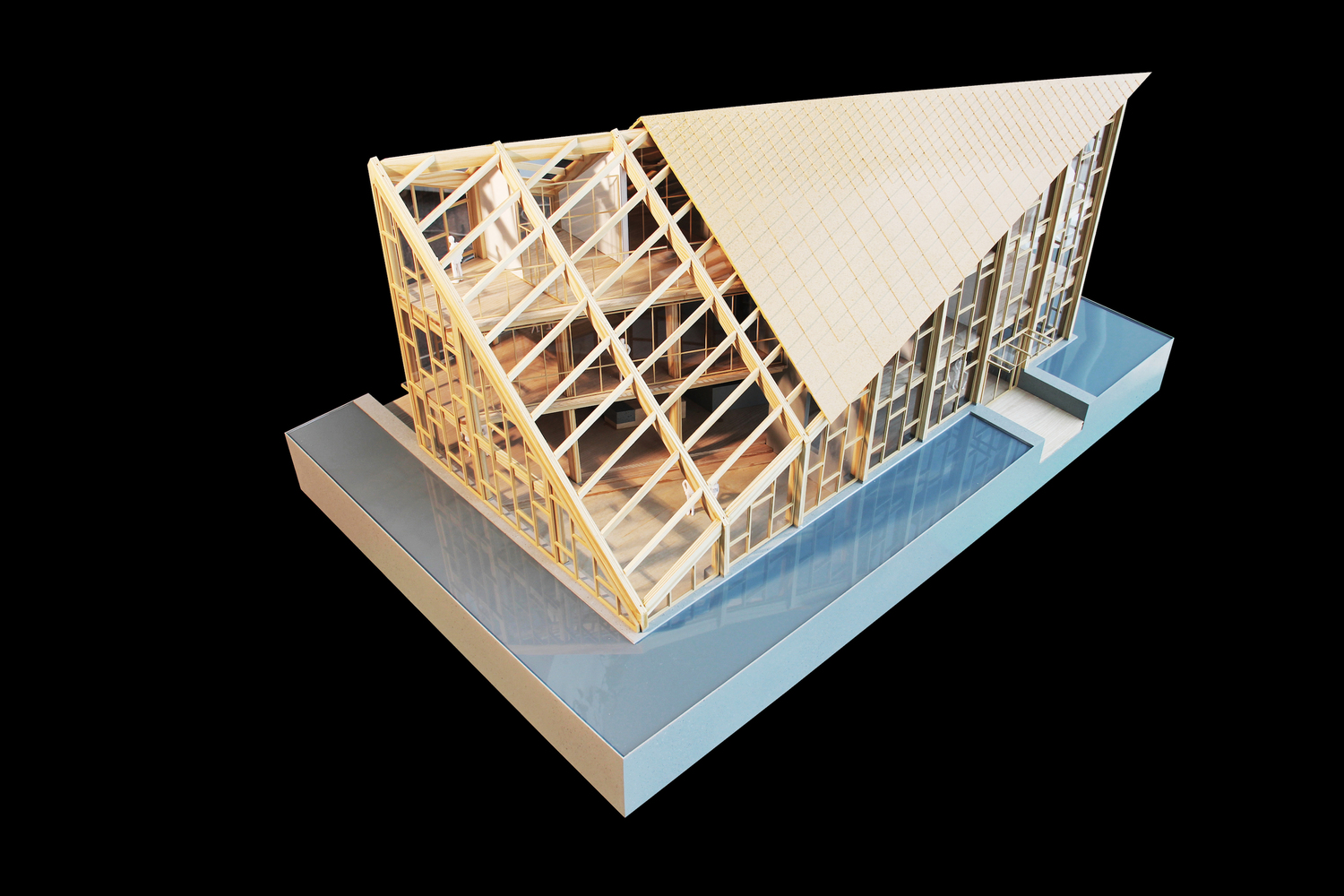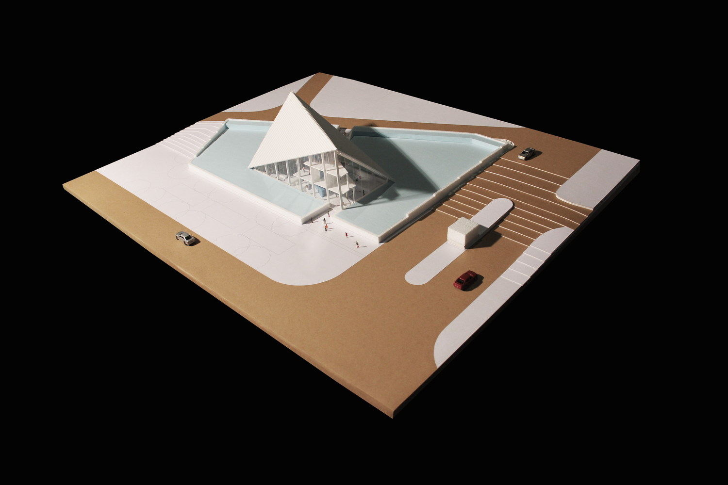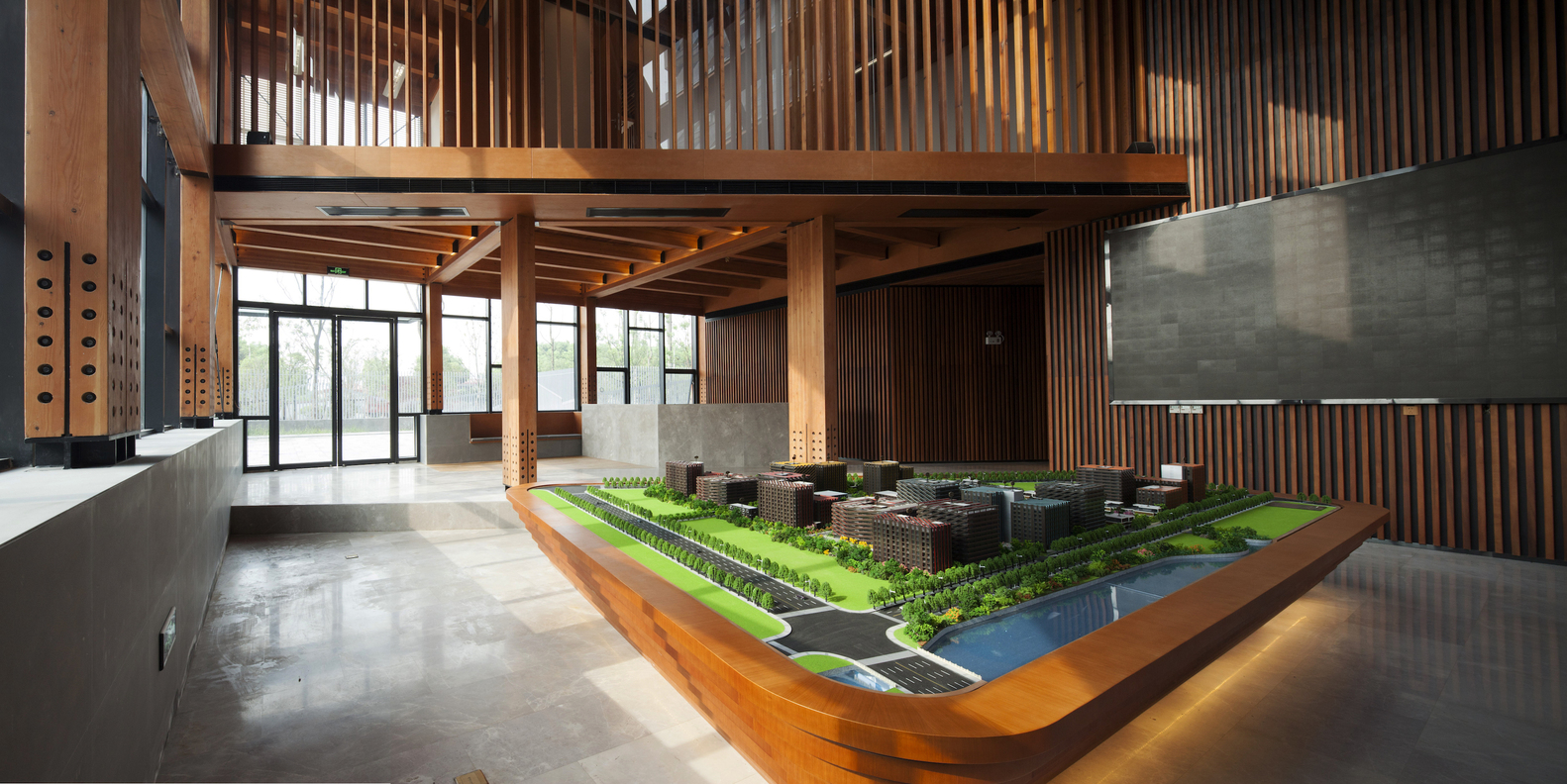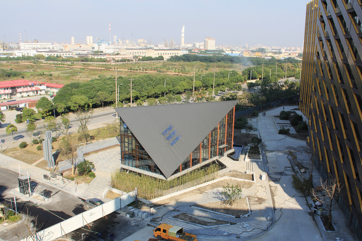 项目位于上海闵行区。是一个大型产业园区的展示中心和管理办公室。设计最初的概念是“一张对折的纸片”,以两个点轻盈的落在水面上。